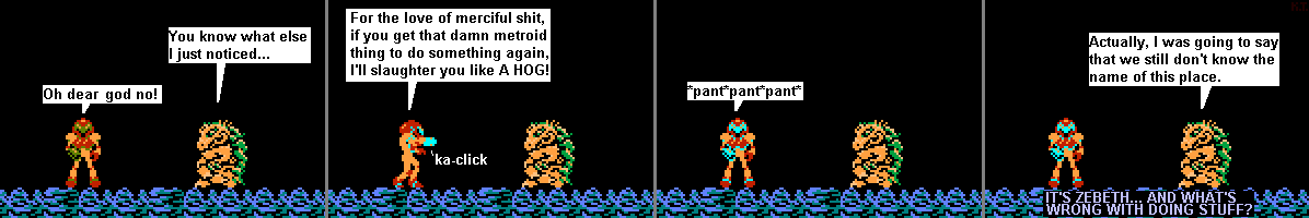 Just thought I'd mention here that now the actual title of the comic strip in question will make slightly more sense. Yes, Samus and Kraid finally learn the secret (well, not so secret) name of the planet. It's almost a monumental occasion... one that should be remembered for... ah, screw it.