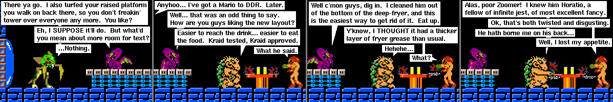 Metroid, Samus, Kraid, and the rest of 'em are all property of Nintendo, who to my knowledge wouldn't do anything such as sue me or shut poor Planet Zebeth down, because they're so damn nice, and Metroid kicks ass : }