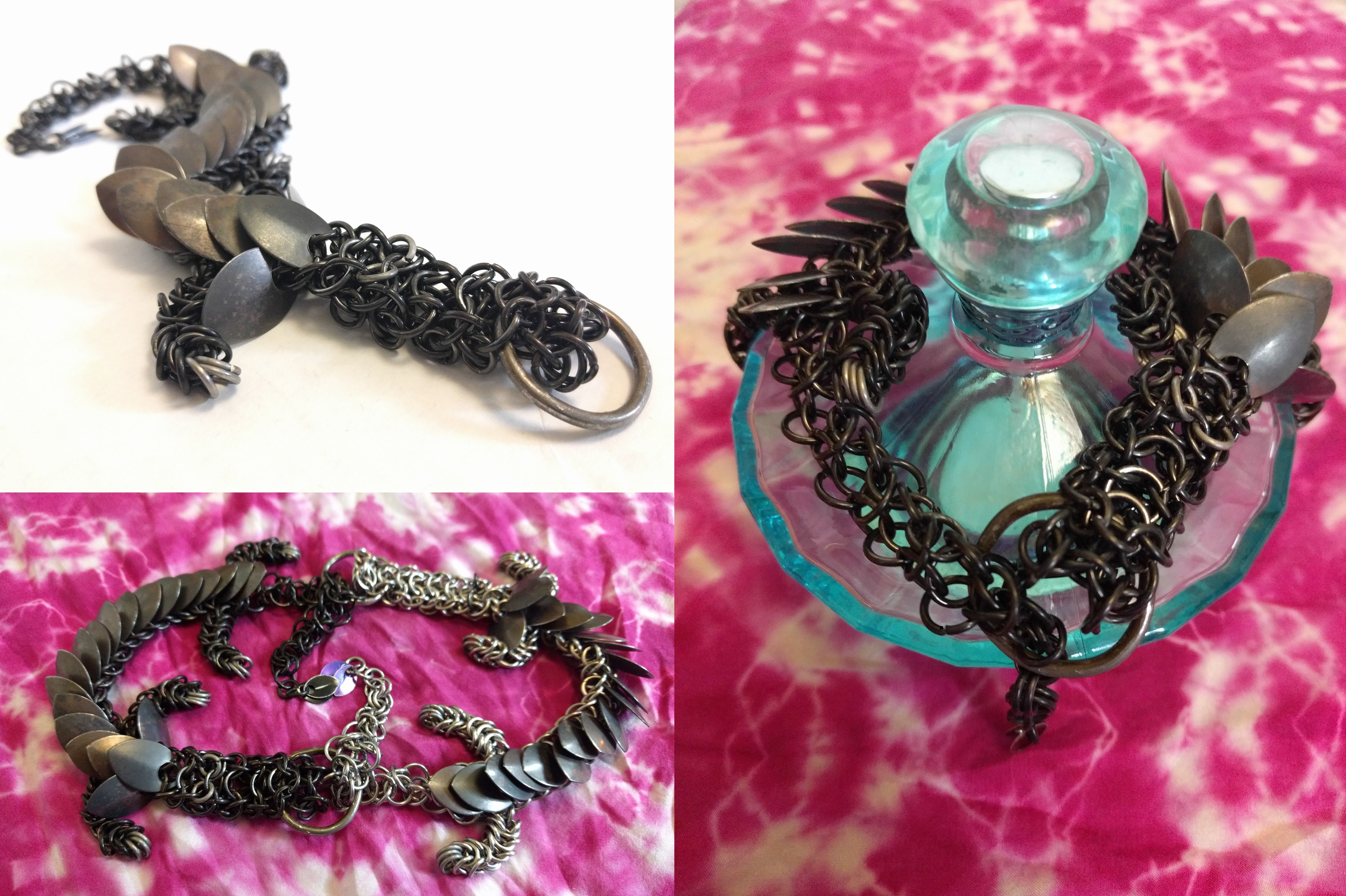 | Venus - February 2017 This was a really fun project, done while livestreaming. Made from a mixture of ring sizes, though all 18 gauge. The head is 7/32"ID stainless steel in alienmaille weave, the body is 1/4"ID titanium in persian dragonscale, the legs are 3/16"ID titanium in roundmaille and byzantine, and the tail is 1/4"ID titanium in elfweave, which tapers down to a pair of aluminum scales. The back scales are tempered high-carbon steel, which have a beautifully weatherworn look to them. There's a handful of other assorted sizes as needed too (including a handmade mouth ring of 12 gauge 11/16"ID enamelled steel coathanger wire, for lack of an available alternative), so she's got a mix of a little of everything in her :) The tail can be threaded through the mouth ring and connected a clasp beneath the last back scale and worn as a bracelet :D A gift to my bestie's daughter Zöe ❤ |