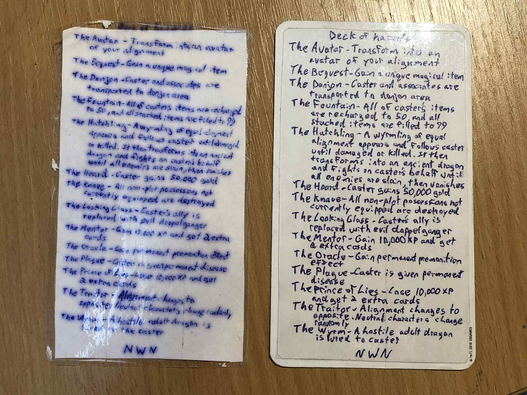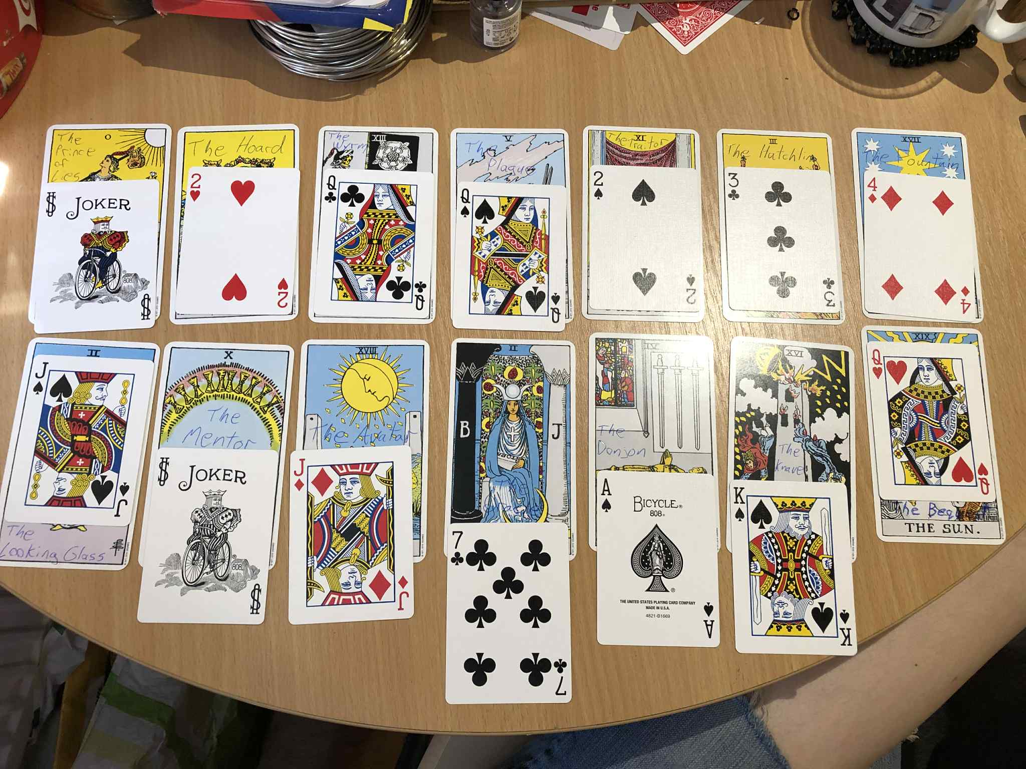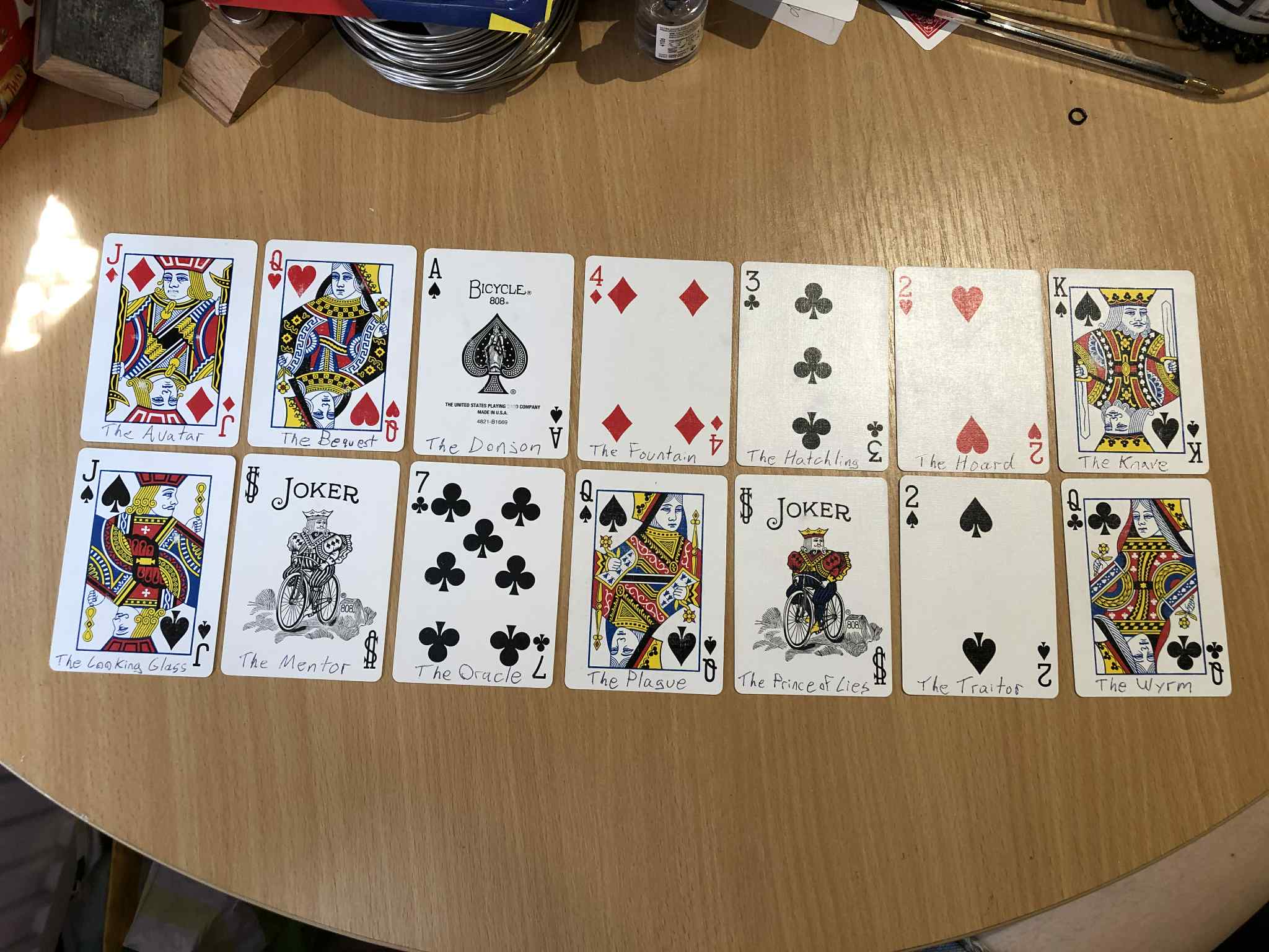 J♦ - The Moon - The Avatar Q♥ - The Sun - The Bequest A♠ - 4 of Swords - The Donjon 4♦ - The Star - The Fountain 3♣ - 3 of Wands - The Hatchling 2♥ - King of Pentacles - The Hoard K♠ - The Tower - The Knave J♠ - 2 of Swords - The Looking Glass J° - 10 of Cups - The Mentor 7♣ - The High Priestess - The Oracle Q♠ - 5 of Swords - The Plague J - The Fool - The Prince of Lies 2♠ - Justice - The Traitor Q♣ - Death - The Wyrm We also decided to re-write the instruction card as well, since for some bizarre reason the ink kept blurring more and more over time, I'm thinking perhaps the paper was slightly damp or something when it was first made. So we used waterproof paper to write the second one, which looks a lot better now ^_^ Updated August 13, 2025 |