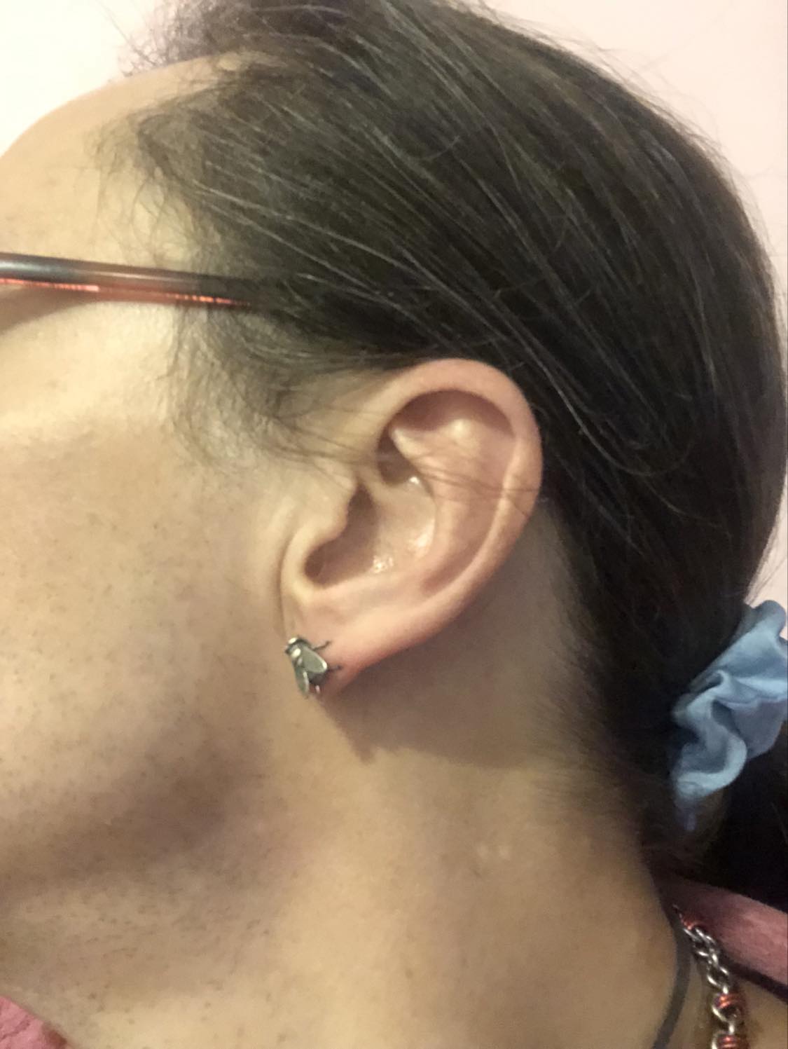 Oh yes, we have housefly earrings! A bit of a tale for you! So I first ordered these from Etsy, two pairs of them in case I lost one and I'd be devastated if I didn't have a pair, but only one pair showed up! So I messaged the seller, but at the same time we were just moving to a new place, so I ordered another pair to the new address, and they sent two pairs in that one! So I ended up with three pairs total (the seller was good about it), so here I am with six housefly earrings, and wouldn't you know it, I have six piercings! So we know what must be done! So after the move, and finally digging out the original pair after the replacement pair(s) arrived, and our little housefly friend showed up right on the day I was planning on wearing them all! I had originally debated whether to add the bellybutton piercing, but I mean... I still had one earring left, I had to try lol.