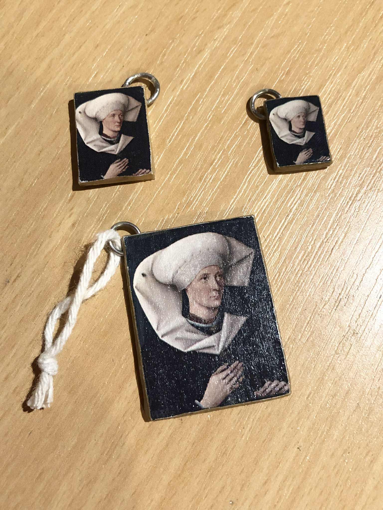 So we decided to print out a wee lil version (and soon several) of the Portrait of a Woman of the Hofer Family. Yah I know I'm enamored with this painting lol. It started out with just making a little palm-sized one to hang on the wall, with the idea/concept still fresh in my mind from the Team Sky emblem. And then after that, I decided to make a whole pile of photo ornaments, and thought... eh, I want one of these mini-paintings for the wall, let's make one more for the tree, and one liiittle tiny one to extra-strong-topcoat (that was actually made at the same time as the main one, as a test to see if the varnish would mess with the printout) to have on my keys. An so it was.