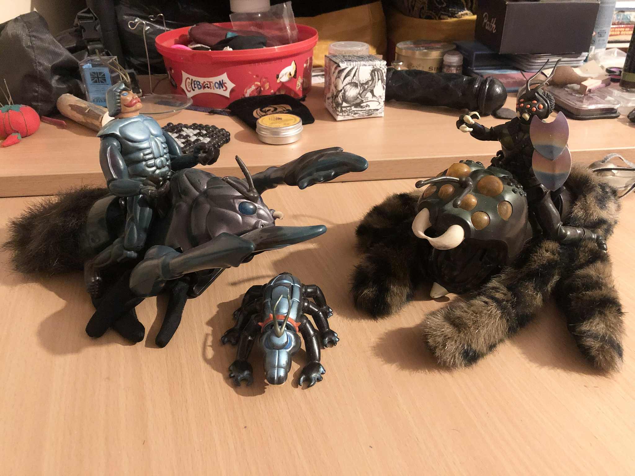 The original original one, as a basically feral child, I of course chewed apart the antennae, the rubbery white teeth, even the saddle. I loved that thing. Now at some point later on, that glove monster living with me through all of my life, I ended up finding a half-broken one at a garage sale and was able to replace the gnarled parts. Also I painted the tongue red, which I didn't end up liking, but oh well. And then that one ended up disappearing somewhere along the line, either lost in a move or whatever, and I bought another one online, with the missing Skulk figure atop (the spider-glove is named Trancula). That one ended up going missing, I think with a box that didn't make it to England. So now, I've bought a third one, third time's the charm! Now, this Skulk didn't come with all of the accessories (the last one at least had the insect wing spear thing). It actually didn't come with any accessories, I ended up doing a second ebay purchase to get two swords (strangely), a spare harness, the box (kinda cool), and more importantly (aside from the swords), the mini comic book! So those are treasured items returned to my collection (the comic you can read here [sectaurs.com]), and I was happy. Except... this can be improved. His holster is empty! Sure, he has two swords, but... but he had a... spear? I think from my research, that heart thing is supposed to be a spear, and a shield! So it started with a shield. I still had some large chainmaille scales, so I glued a few of those together, and used wire and JB-Weld (good ol' JB-Weld) to form a grip for Skulk to grab onto. But... I still had some epoxy left! Ummm, ok, ok, let's kinda halfway form the pistol shape out of that bit, why not, let's give him a ranged attack. And in the midst of that, I went back into my childhood again, a little bit. Back in the day, I used to make accessories for my toys by hammering a nail flat on the back of a table vice, vaguely sharpening it, and using whatever tape was around (usually electrical tape) to bulk up the grip. I decided to give a nod back to that, and though I didn't have any nails around, I did have coathanger wire, which is mild steel wire of about the right diameter! So in going back to my favourite "sword" that I made back then, I created a sickle shape (we had scythes all over the place growing up), but a bit longer to turn it into a sickle-spear! Yah, that sounds like something young me would have come up with lol. So we hammered the sickle end and spear end flat (except here just on an old rusty plate of steel on the grass), but this time, also to better bulk out the back of the shield and laser pistol (all cartoons had laser pistols lol), I used that JB-Weld again. We made all the grips the right size, and then carved some decorative linework into all of the things, and... WOOH, we have accessories! Am I gonna paint it, nah. The original accessories were all a single colour, paint would just rub off, and this actually matches pretty good anyway! And it's simple, rough, pretty much like I would have done when I was 10. Added bonus tho, I did balance the sickle-spear around the main shaft, so that it would (in theory) throw straight! And they came out awesome, and it looks cool clipped to the back of Skulk's harness, and the holster is full when he puts his sword away, and I am happy, WOOH! A quick several day build reliving my childhood a little bit. Also as an addendum to the story, in the first pic, we have the ORIGINAL original Battle Beetle toy with Pinsor riding him, that somehow did survive through to the present! I think this was my brother Greg's toy, that somehow landed in my lap over the decades, and I'm guessing that Bitaur (who would normally come with Zak) was the one my other brother Charles got, but I've had Bitey as my own ever since childhood, so maybe Chaz gave him to me way back then? Also a prized childhood toy, but I think that's the second iteration of Bitaur in my collection. A little bit of the trio of all of us closely-aged siblings together (my other sisters were much older, but I've got ot Finished January 2, 2026 ![]() |