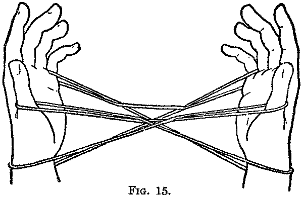 In the Second, the method of transferring the index loops to the wrists is unusual; as we shall see further on, a more complicated method is almost always employed. In the Third movement the changing of a string from one finger to another by means of the thumb and index of the other hand is a process not often observed. Indeed one may easily believe that the methods given in these two movements are short cuts peculiar to the individual who taught me the figure, and that, some day, other Indians will be seen doing these movements in the usual elaborate style, whereby the strings on either hand are shifted and arranged by the fingers of that hand only. As far as I know, the Fourth movement has not been observed in any other string figure. The rubbing of the hands together in the Sixth movement is, of course, only for effect; it has no bearing on the success of the figure. The manner of showing the finished pattern, what we call its "extension," is of the most simple type; indeed the figure practically extends itself when the hands are drawn apart.