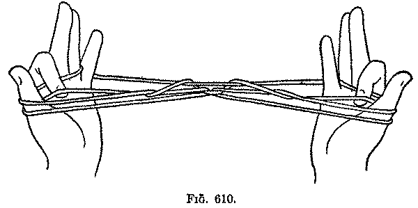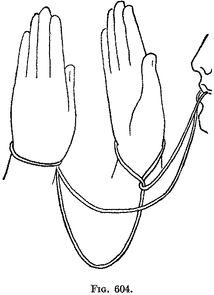 The methods which lead to the final extension of this figure (the Third and Fourth movements) are similar to those in the preceding figure ("One Chief"), but all the other movements are new. At first sight, the opening movement appears to be a difficult and elaborate way of putting loops on the little fingers and wrists, but it is really the easiest and most direct method, not only of getting the loops, but also of making the strings cross one another in the way required for the subsequent success of the figure. In only one other figure (the "Pygmy Diamonds") are the loops dropped from the wrists, and caught, while dropping, upon the thumbs.