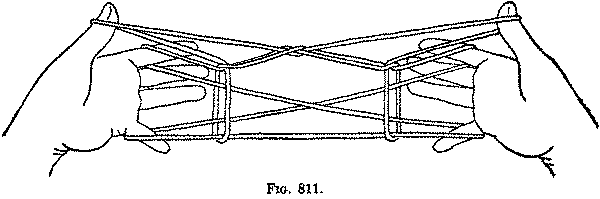 (4) Pou; a post. No. 21451, Culin 1, pl. xv, e (Fig. 847). This figure can be made from the "Bow" opening by transferring the index loops to the little fingers, picking up the near little finger strings with the thumbs and finally slipping the lower thumb loops off the thumbs.