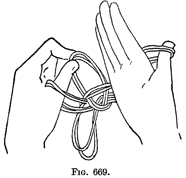 Third: Pass all four fingers of the right hand up on the near side of the left thumb loop and put them from below into the left index loop, so that the left near index string becomes a palmar string on the right hand (Fig. 666); remove the left index. With the left thumb and index take hold of the palmar string of the loop which is on the right index (above the right palmar string) (Fig. 667), and, keeping the loop on the right thumb, withdraw the right hand from all the other loops (Fig. 668). Turn the right hand again so that the finger tips sweep toward you under the figure and point upward, the palm facing toward you (Fig. 669).