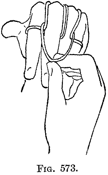 Seventh: At this point, place the loop held by the right thumb and index over the left thumb and, being careful not to twist it, let it hang down (Fig. 575).