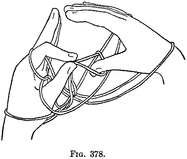 Put the left little finger, from the near side, through the long loop (Fig. 381), and put the left thumb above and to the left side of the near string of the loop now on the left little finger, and then, toward you and from the far side, through the smaller loop (Fig. 382). Separate the hands (Fig. 383).