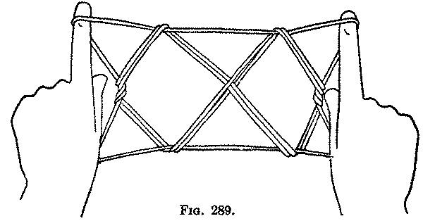Sixth: Release the loops from the thumbs, and, turning the palms away from you, extend the figure between the index fingers and the ring and little fingers closed on the palm (Fig. 289).
