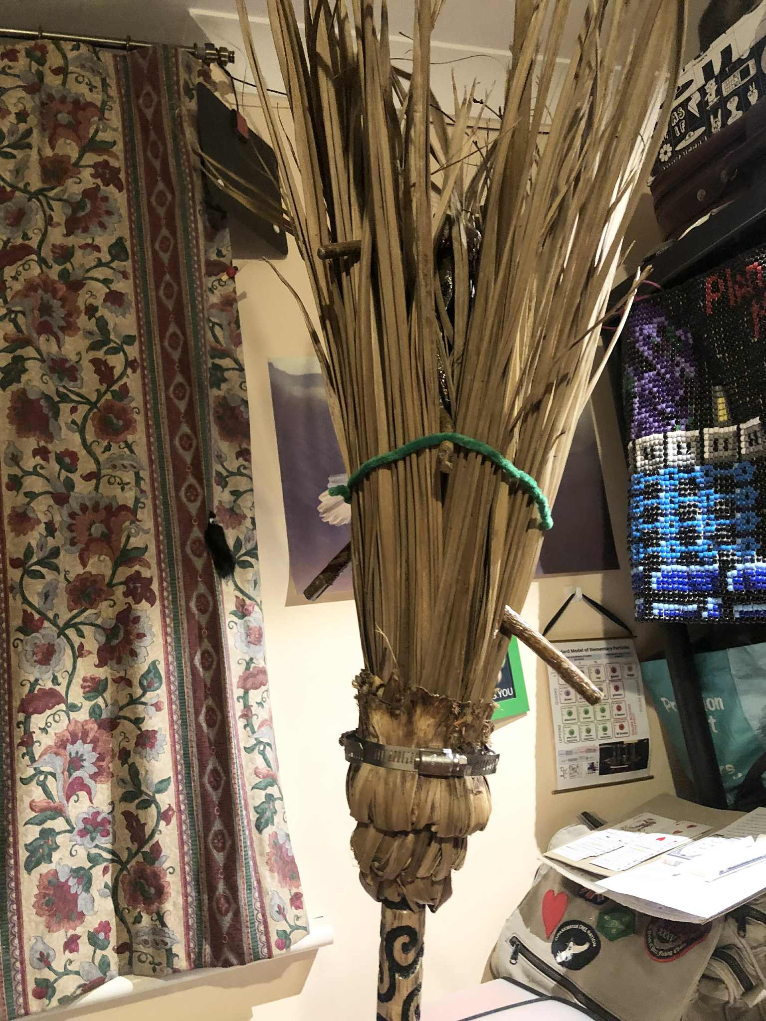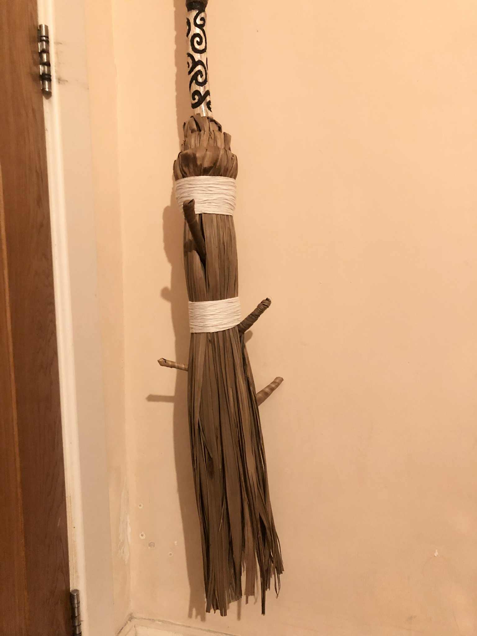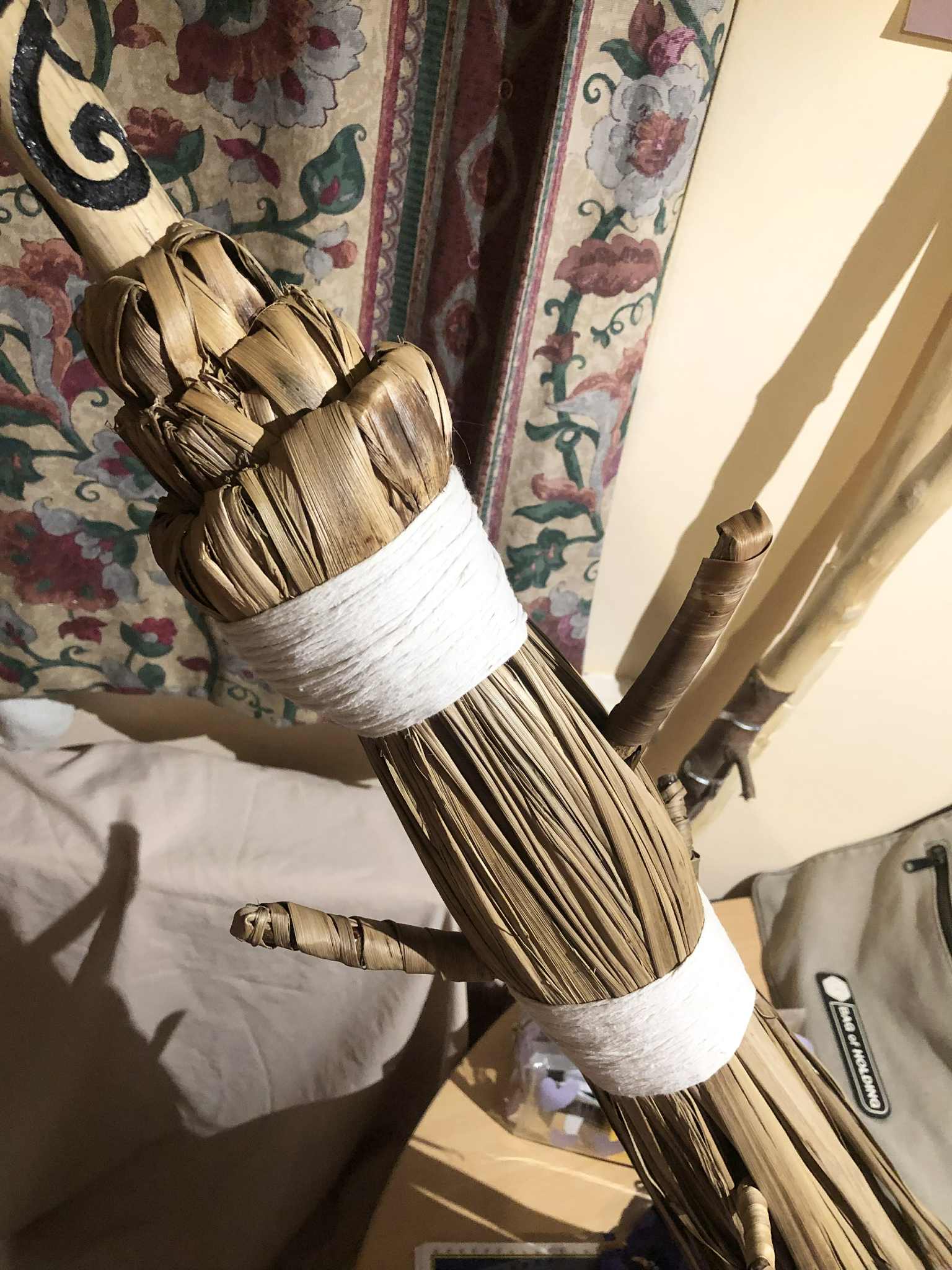 My witch's broom. It started as The Twisted Sisters, which had some halloween vibes put onto it, and was all cool and stuff, but... oh my GOODNESS is it inconvenient! I mean those branches sticking out, they look awesome, it wouldn't even look right without them, but WOW was it getting in the way! And FRAGILE. So after years of it sitting sitting with the other staves, forever making everything inaccessible, staves getting caught behind it, around it, those branches just *forever* being in the way. And I frustrated around it, until one day, someone in one of my online groups mentioned making a besom. And over the past, others have done so, and it was all awesome and stuff. And one day after it stuck in my craw one too many times, I decided, the best way to solve this was to turn The Twisted Sisters, which had been my default witch's broom because of the branches anyway, into a full besom. The bristles would protect the fragile head, bulk up the head around the branches in general to keep it from snagging on everything, and I could hang it on the wall to keep it out of the way in general, until actually using it for witchy purposes, like sweeping out the bad energy and such, also maybe sweeping in general.