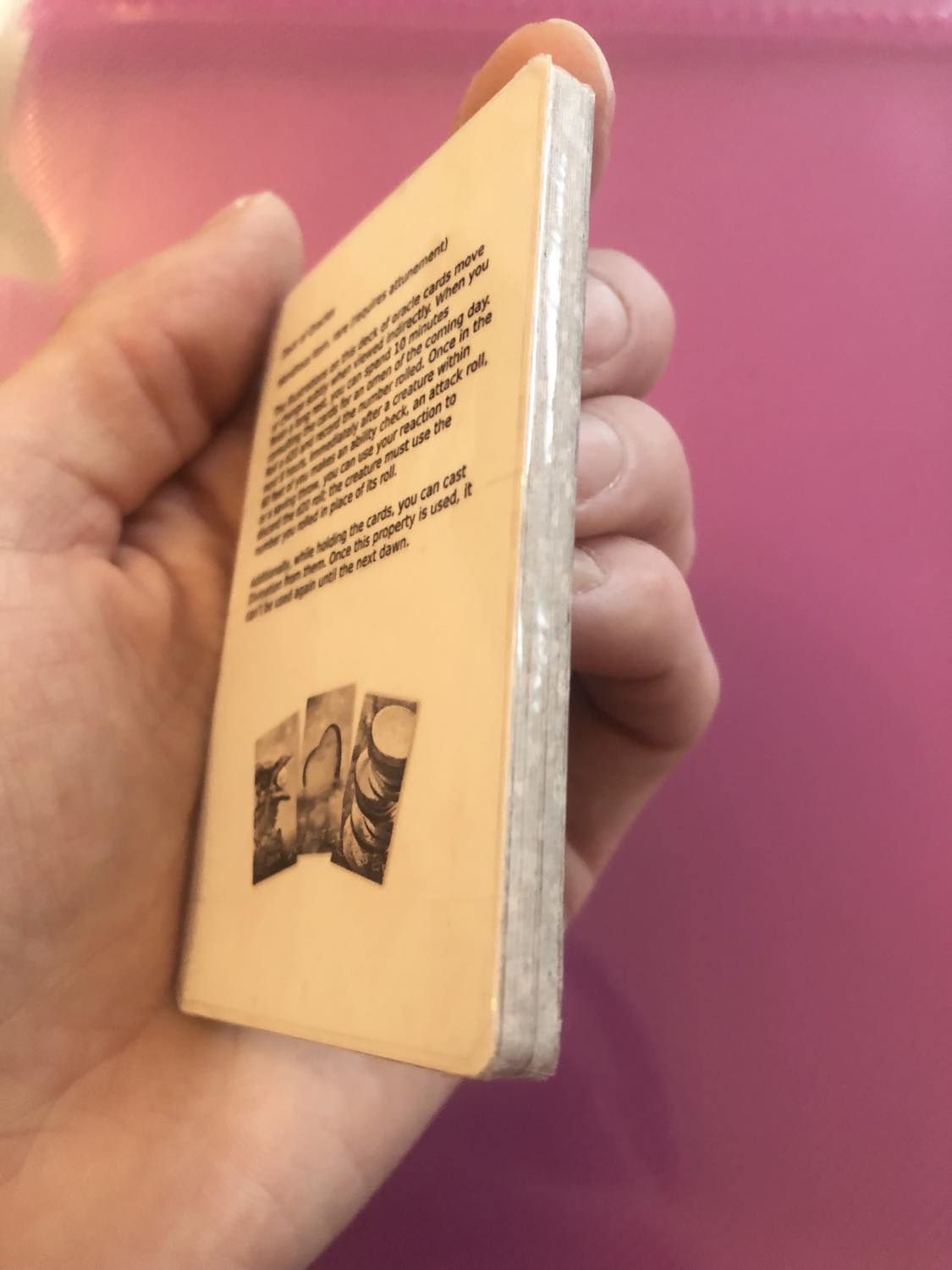 The Deck of Oracles, the other non-random deck named item in the deck of many things box set. Basically, you get to roll a d20 once per day, and replace an enemy's roll with that one. Alternatively you can cast divination once per day with this item. So of course, being a deck-named item, I had to make it. Pretty simple, since I had actually bought like 3 decks of cards to make the Deck of Many More Things (due to wanting to re-write several of them for neatness), I had a pile of spare cards laying around. So I picked a stack of cards that I thought would make a good look to it, seventeen of them as it were (no significance to this, just... a good thickness that looks like a potential small oracle deck size), and taped 'em all together! Yah since you don't randomly draw from this item, I didn't want to make the cards removable, just a simple item. Although, as well as the tiny text on one side, I found a free oracle deck card back to tape to the other side, to make it look different than the Deck of Dimensions, and also the Wild Cards and Many More Things cards that use the blue diamondprint card back. It just felt good to make it different. And so, with the bundle and tiny text and card patterns taped to either side, we created the Deck of Oracles item! Made December 20, 2023 |