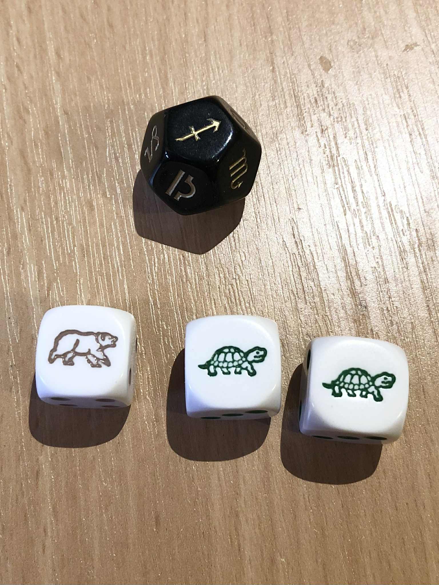 Ok ok ok, another dice splurge (said the dice goblin). I was looking for some inexpensive retail therapy, and someone posted online their dice collection that included a zodiac dice, and I once again returned to the thought of 'awwww, I've always kinda wanted one of those'. So off we go to The Dice Shop Online again, and kinda poke around at what they've got. I think they happened to show a picture of a dice with a bear on it, and I'm like... oh, I NEED to get that to go with my bear paw tattoo. So I started thinking... what other animals are significant enough to warrent an animal dice. Of course, Upulnesayay, my Spirit Guide! So, the store only sold turtle dice in a set of 5 as a game (instructions here if you're curious). And I do have a second Turtle Spirit Oka, Upul's daughter, thus keeping two (and my Bear Spirit Pete is also connected to my Indigenous Spirituality, so He slides into that one too) (and to be fair, my Dragon Spirit Skote has a hollow metal dragon d20) (we do also have a Duck Spirit tho) (also the Fly familiars) (the whole roster). I like that I could get the bear in brown and the turtles in green. And I like this pic, it feels a bit like The Incredible Journey (Wikipedia), except with two turtles and a bear travelling together, perhaps following the stars. Though in this case, I imagine the turtles would quickly start riding on the bear for speed lol. |