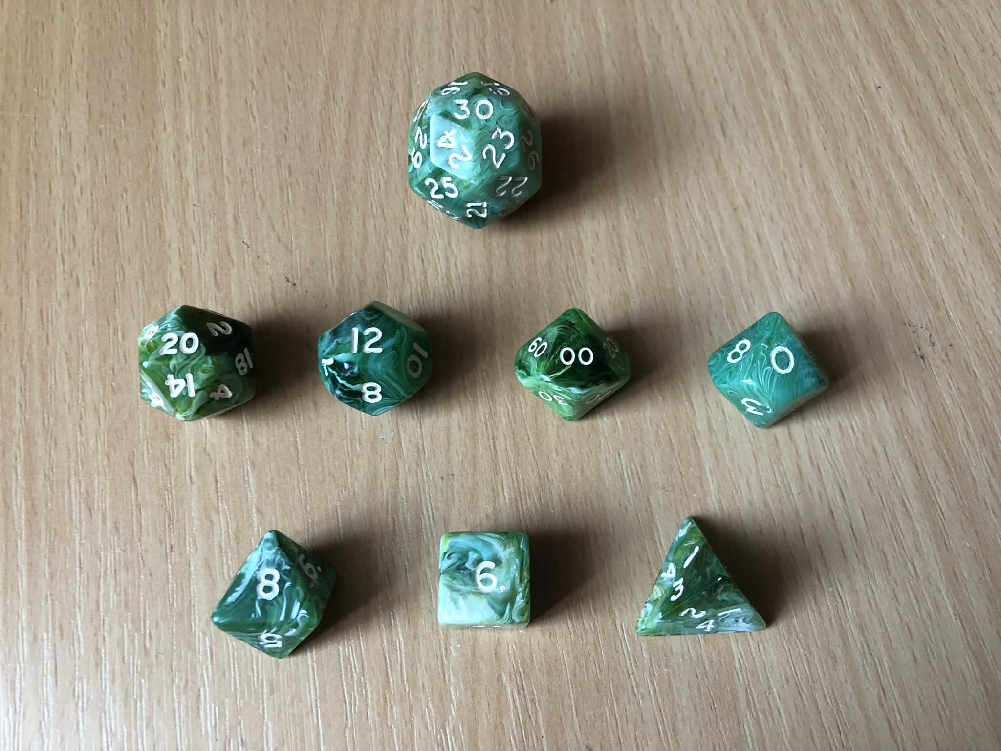 | It began with a green speckled dice, the only green dice available in the gaming store that my friend J1 took us to. We were playing L5R, Legend of the 5 Rings. I actually ended up giving a lot of those away, bit of a story behind that. Y'see, originally in playing L5R, that game only uses D10's, and so over the four year campaign, I ended up collecting a lot more of the same dice pattern, in order to collect enough 10 sided dice. I also picked up a Chessex Rainbow Peridot D30 around this time, mainly because "oohh, cool, 'different' sided dice that's also green", which is apparently now quite rare. And the excess of those speckled loot dice is how we came to create a two, three, five, and seven sided dice of that set, because we had SO many extra dice that weren't being used, that I used our family's table grinder to turn a number of those into the aformentioned dice. A little bit wonderful, and over time, when the rest of the dice collection came to be (also J1 gave each of us our L5R clan dice sets), I ended up deciding to give away the extra Chessex speckled loot dice (keeping one set for myself, and the modified dice) to a random person in the Goblin Dice Hoard facebook community (private group, just search for it), and happiness was had by all. |