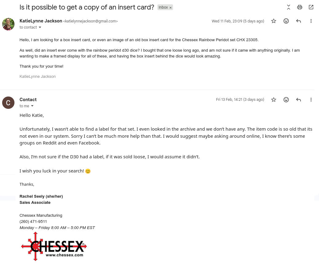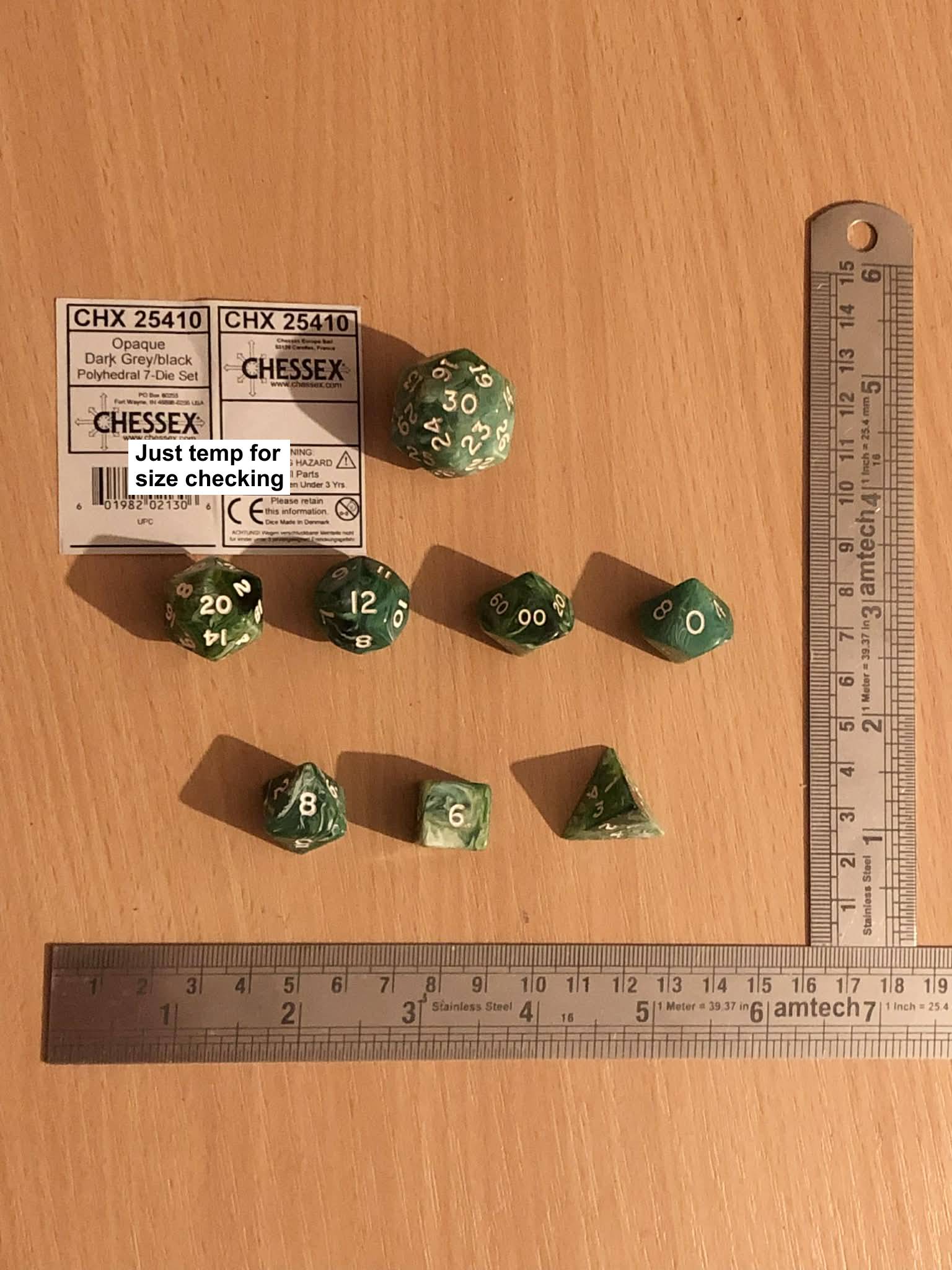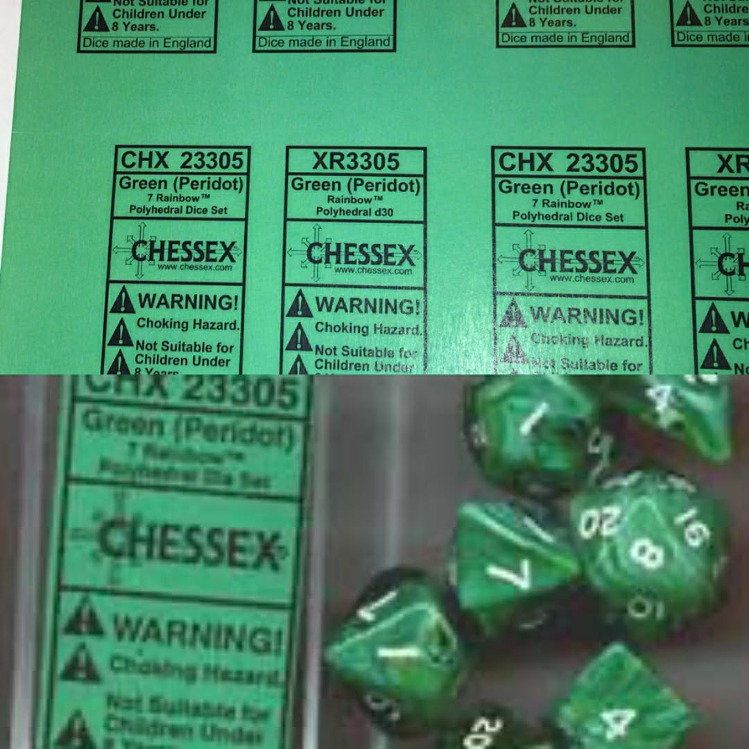 The frame build page! I originally started this on the dice page, but the progress was starting to get complicated enough that I didn't want it cluttering the dice page, so you get your own page here, tuck you away back here. As I'd said on the main page, I'd debated whether to piece together my own set, and had actually paid far less for a partial set before researching more and discovering that the percentile is ALSO extremely hard to find. So rather than worry about never finding that (the partial set will be for my rolling dice, so I can still enjoy playing with this pattern ^_^ . Also they could be good for tradeables!), I just ordered the full set listed (strangely from Flin Flon, very near to where I used to live)! Aaaand that my friends. Those eight dice, as of January 2026, are worth £300gbp / $400usd / $500cad! Those seven dice arriving over doubled in price the second they arrived at my door (February 16th)! Naturally, we need to display these. A shadow box frame will suit this best, with the dice gently suspended to be as fully visible as possible. Also, I have already attempted to contact Chessex in order to get an info label that they normally come with for the display, but they said that this set CHX 23305 is so old (out of print in 2001, older than Zebeth!!!), that they don't have any copies of it in their archives, or system at all! So we will have to make a mock-up to put in the frame with them (and label it as such on the back of the label, for transparency purposes). So... let's get started! Ooohhhh, and leading up to this, we did some research, and found some epic things. First, allow me to link you to the present day webpages for these dice on the DrNoD DiceDB (db.drnod.de) and Miraheze Dice Collecting wiki (dice.miraheze.org). Secondly, we decided to dig into the Chessex webpage (chessex.com), but on archive.org, where we found the first mention of these as a polyhedral set in 1999 (archive.org), the first mention of the poly set as CHX 23305 Rainbow™ Peridot™(Green)/white (also CHX 23305 Rainbow™ Polyhedral Green/white 7-Die Set) in June 2000 (archive.org), the first mention of the d30 as XR3005 - Rainbow™ Polyhedral d30 - Peridot™ (Green) in October 2000 (archive.org) (images weren't backed up in those though, but the 1999 link shows the d6 of the poly set (screenshot), and the full poly image was backed up in July 2001 (archive.org) (screenshot), and the d30 also in July 2001 (archive.org) (screenshot).