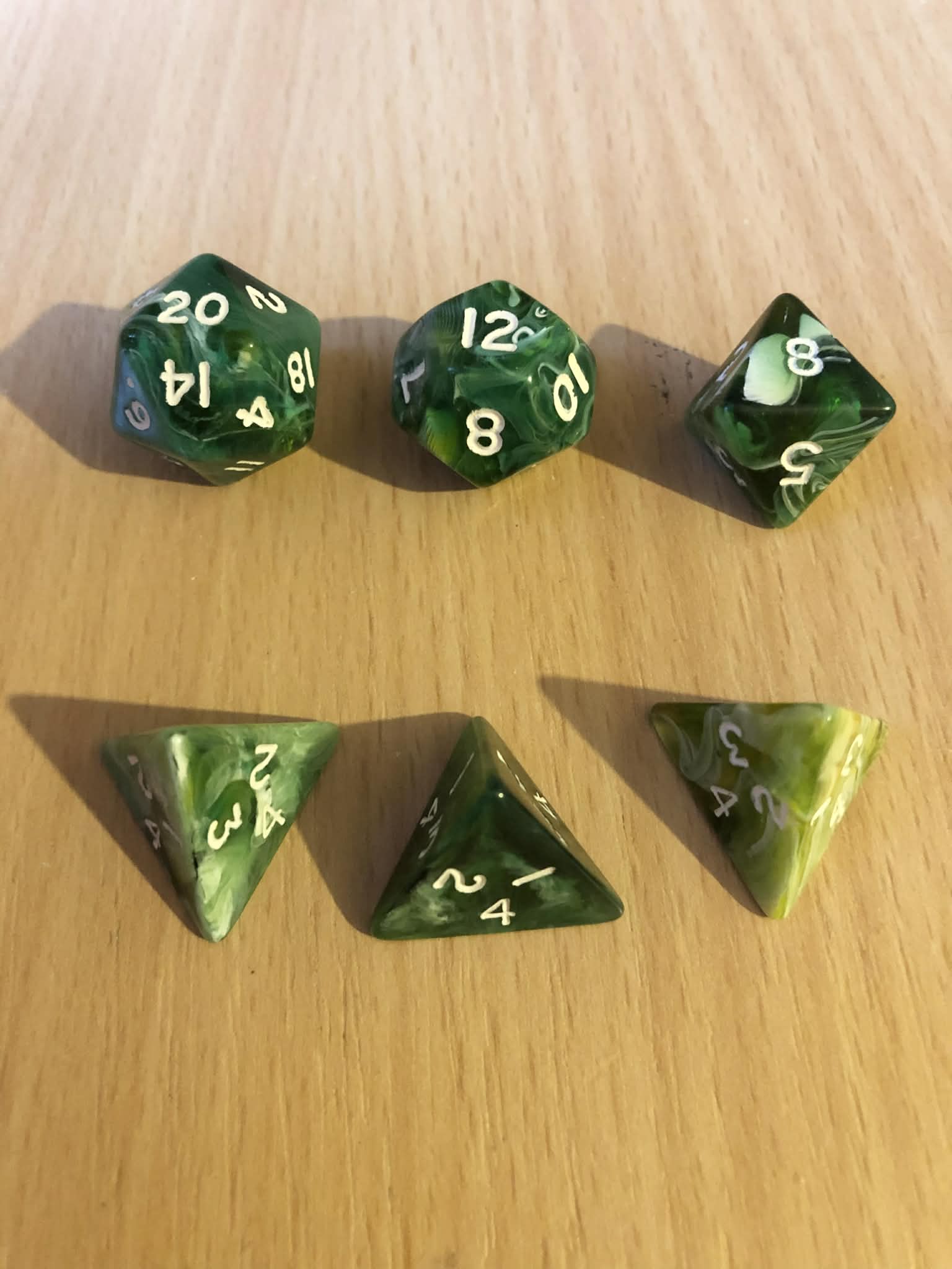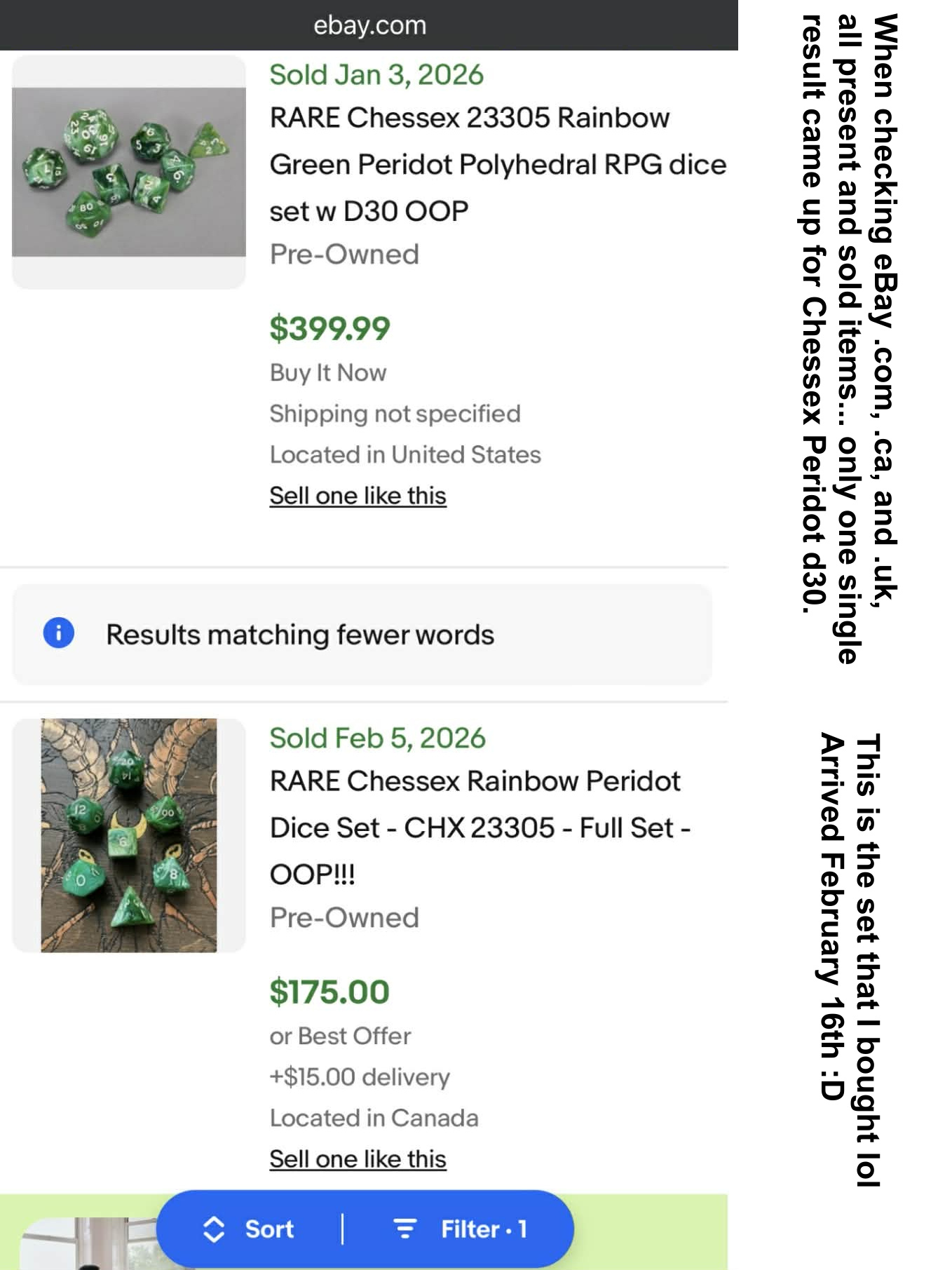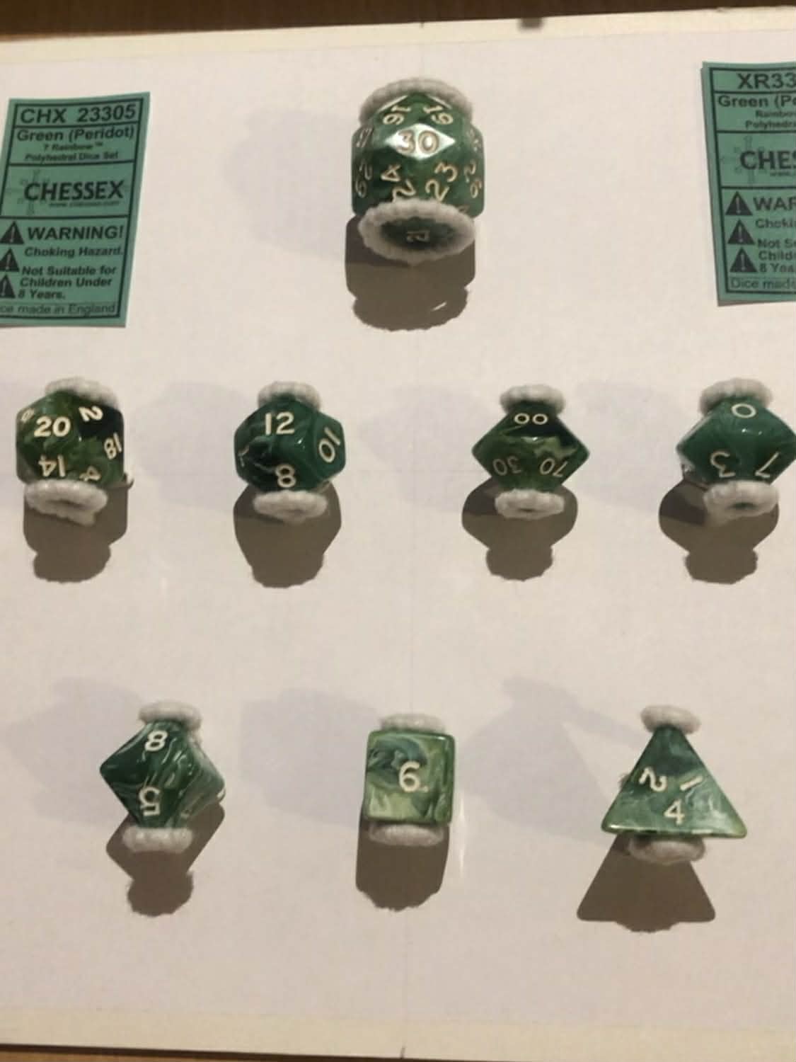 The frame build page! I originally started this on the dice page, but the progress was starting to get complicated enough that I didn't want it cluttering the dice page, so you get your own page here, tuck you away back here. As I'd said on the main page, I'd debated whether to piece together my own set, and had actually paid far less for a partial set before researching more and discovering that the percentile is ALSO extremely hard to find. So rather than worry about never finding that (the partial set will be for my rolling dice, so I can still enjoy playing with this pattern ^_^ . Also they could be good for tradeables!), I just ordered the full set listed (strangely from Flin Flon, very near to where I used to live)! Aaaand that my friends. Those eight dice, as of January 2026, are worth £300gbp / $400usd / $500cad! Those seven dice arriving over doubled in price the second they arrived at my door (February 16th)! Naturally, we need to display these. A shadow box frame will suit this best, with the dice gently suspended to be as fully visible as possible. Also, I have already attempted to contact Chessex in order to get an info label that they normally come with for the display, but they said that this set CHX 23305 is so old (out of print in 2001, older than Zebeth!!!), that they don't have any copies of it in their archives, or system at all! So we will have to make a mock-up to put in the frame with them (and label it as such on the back of the label, for transparency purposes). So... let's get started! Ooohhhh, and leading up to this, we did some research, and found some epic things. First, allow me to link you to the present day webpages for these dice on the DrNoD DiceDB (db.drnod.de) and Miraheze Dice Collecting wiki (dice.miraheze.org). Secondly, we decided to dig into the Chessex webpage (chessex.com), but on archive.org, where we found the first mention of these as a polyhedral set in 1999 (archive.org), the first mention of the poly set as CHX 23305 Rainbow™ Peridot™(Green)/white (also CHX 23305 Rainbow™ Polyhedral Green/white 7-Die Set) in June 2000 (archive.org), the first mention of the d30 as XR3005 - Rainbow™ Polyhedral d30 - Peridot™ (Green) in October 2000 (archive.org) (images weren't backed up in those though, but the 1999 link shows the d6 of the poly set (screenshot), and the full poly image was backed up in July 2001 (archive.org) (screenshot), and the d30 also in July 2001 (archive.org) (screenshot).