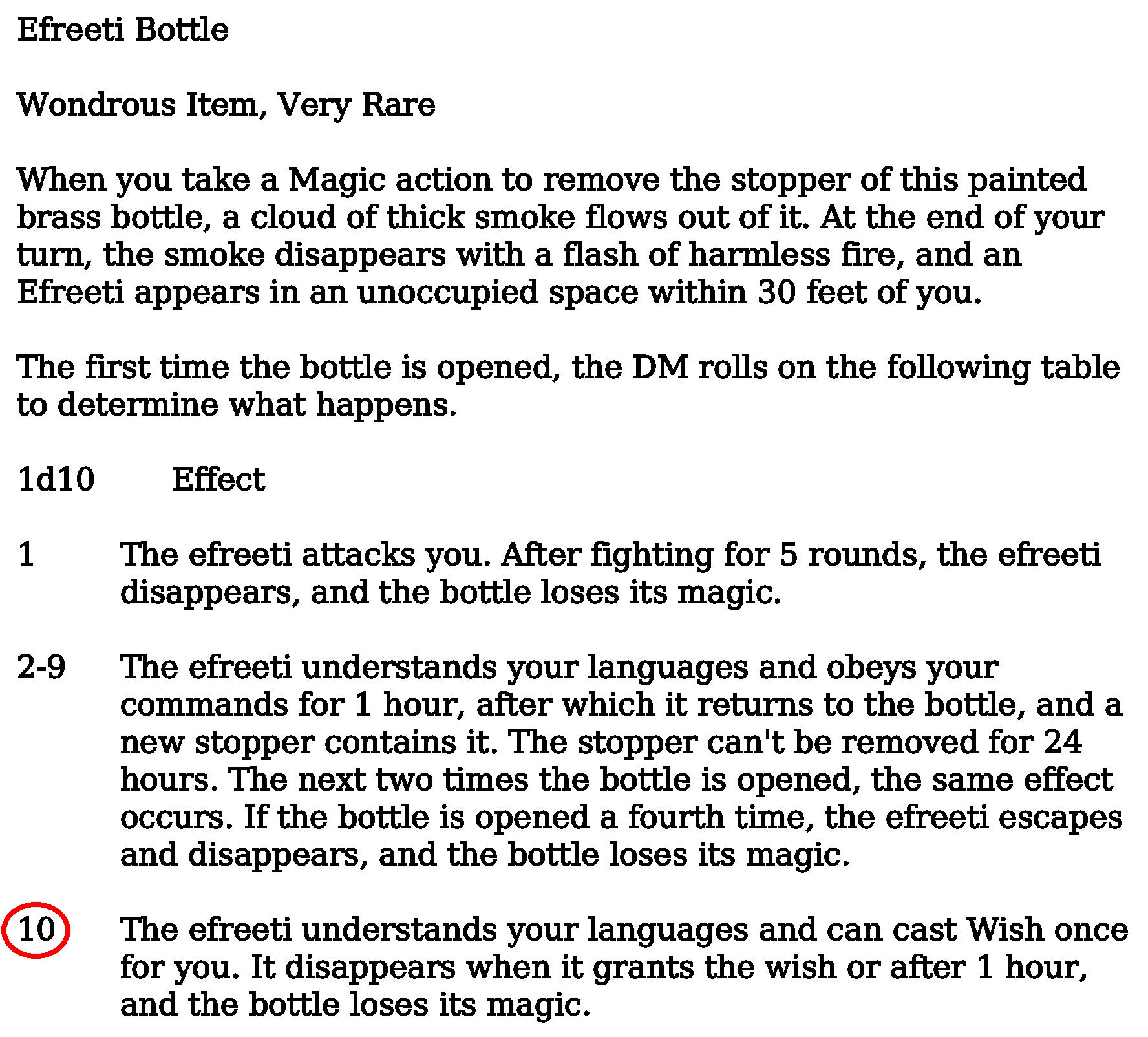 A powerful and benevolent efreeti emerges from the bottle, and offers to grant a wish to the adventurer that called them forth.