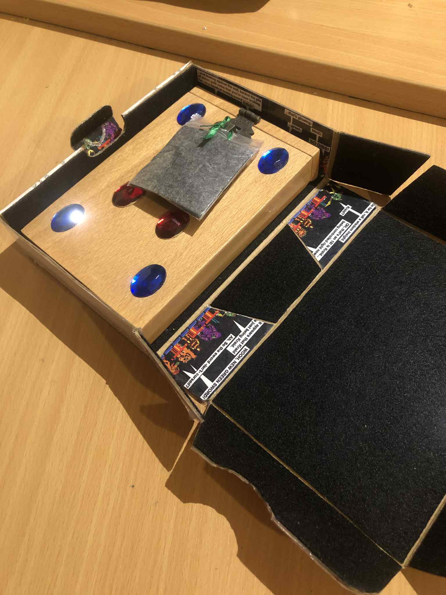 In your searching of the area, you find a small ornate box tucked into a corner. It is made from a beautiful wood and is covered in jewels, and a small lock holds it closed. What do you do? This project began, in a way, with the Harrow deck, and I needed to have the regular Deck of Many Things as well, and so I ordered it off Etsy. At this point, the thinking began. For you see, most Decks of Many Things come with 13 cards, though some can carry as many as 22! I have decided to do both. So for this deck, working with primarily cardboard scraps and extra cloth I had laying around, I set about making a box with two hidden compartments in it, thin little slots where an envelope containing cards might go. The main box holds the primary 13 cards, but with a successful investigation check (after picking the lock, something the players at the table will be able to mess with directly!), they can find that the inner lining can be removed, revealing the two hidden envelopes inside, containing the remaining cards. Inspired by Grog and his Deck of Many Things, of Critical Role ^_^ |