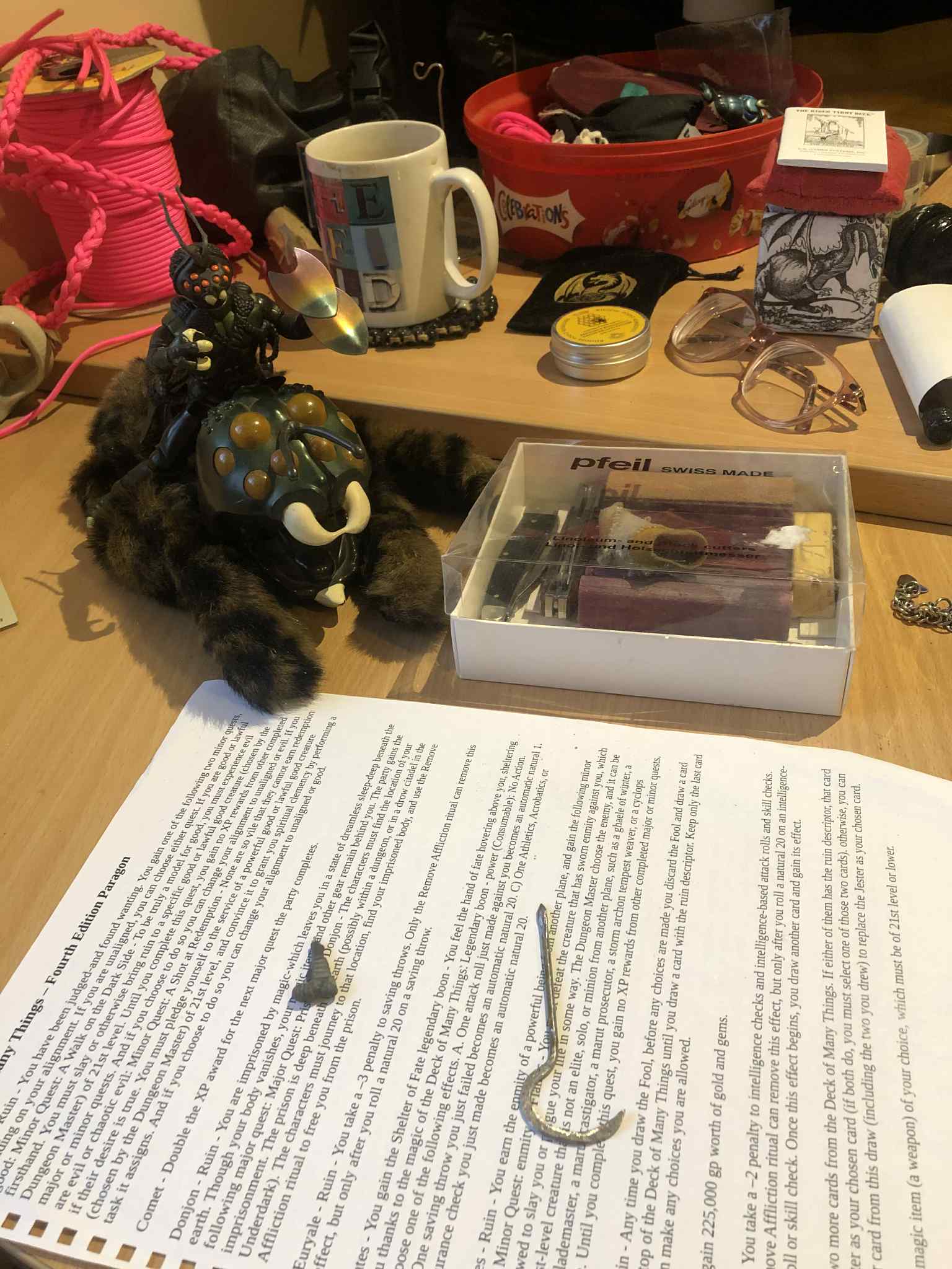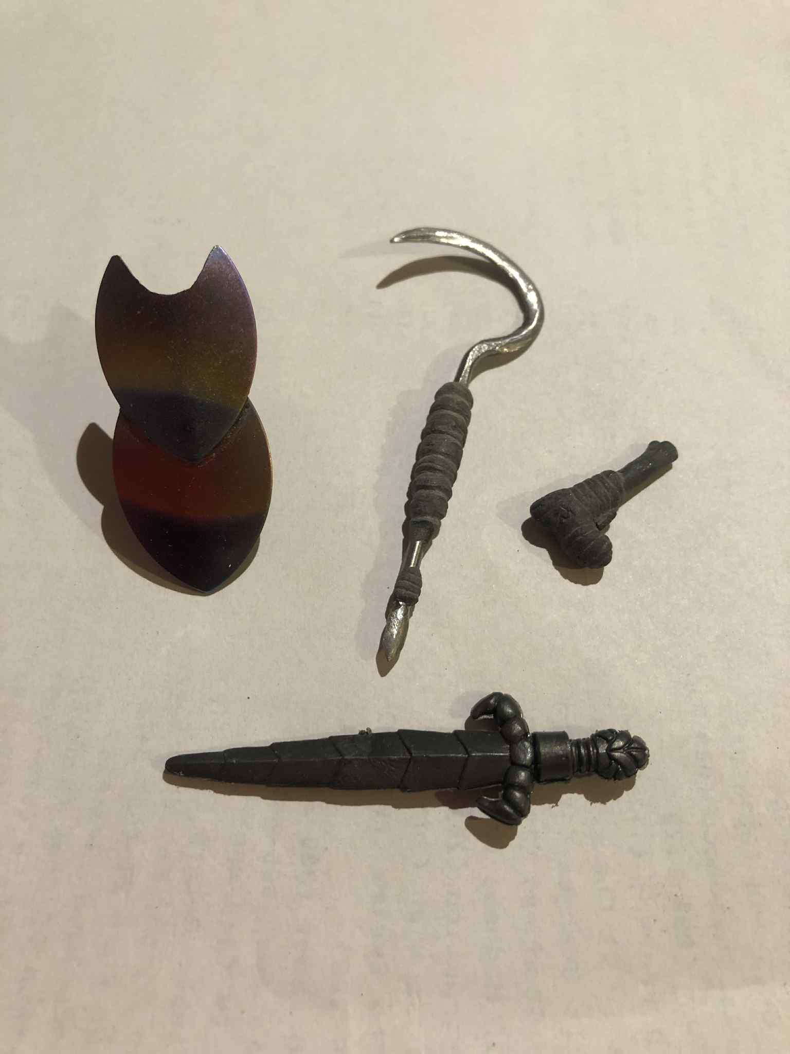 The original original one, as a basically feral child, I of course chewed apart the antennae, the rubbery white teeth, even the saddle. I loved that thing. Now at some point later on, that glove monster living with me through all of my life, I ended up finding a half-broken one at a garage sale and was able to replace the gnarled parts. Also I painted the tongue red, which I didn't end up liking, but oh well. And then that one ended up disappearing somewhere along the line, either lost in a move or whatever, and I bought another one online, with the missing Skulk figure atop (the spider-glove is named Trancula). That one ended up going missing, I think with a box that didn't make it to England. So now, I've bought a third one, third time's the charm! Now, this Skulk didn't come with all of the accessories (the last one at least had the insect wing spear thing). It actually didn't come with any accessories, I ended up doing a second ebay purchase to get two swords (strangely), a spare harness, the box (kinda cool), and more importantly (aside from the swords), the mini comic book! So those are treasured items returned to my collection (the comic you can read here [sectaurs.com]), and I was happy. Except... this can be improved. His holster is empty! Sure, he has two swords, but... but he had a... spear? I think from my research, that heart thing is supposed to be a spear, and a shield! So it started with a shield. I still had some large chainmaille scales, so I glued a few of those together, and used wire and JB-Weld (good ol' JB-Weld) to form a grip for Skulk to grab onto. But... I still had some epoxy left! Ummm, ok, ok, let's kinda halfway form the pistol shape out of that bit, why not, let's give him a ranged attack. And in the midst of that, I went back into my childhood again, a little bit. Back in the day, I used to make accessories for my toys by hammering a nail flat on the back of a table vice, vaguely sharpening it, and using whatever tape was around (usually electrical tape) to bulk up the grip. I decided to give a nod back to that, and though I didn't have any nails around, I did have coathanger wire, which is mild steel wire of about the right diameter! So in going back to my favourite "sword" that I made back then, I created a sickle shape (we had scythes all over the place growing up), but a bit longer to turn it into a sickle-spear! Yah, that sounds like something young me would have come up with lol. So we hammered the sickle end and spear end flat (except here just on an old rusty plate of steel on the grass), but this time, also to better bulk out the back of the shield and laser pistol (all cartoons had laser pistols lol), I used that JB-Weld again. We made all the grips the right size, and then carved some decorative linework into all of the things, and... WOOH, we have accessories! Am I gonna paint it, nah. The original accessories were all a single colour, paint would just rub off, and this actually matches pretty good anyway! And it's simple, rough, pretty much like I would have done when I was 10. Added bonus tho, I did balance the sickle-spear around the main shaft, so that it would (in theory) throw straight! And they came out awesome, and it looks cool clipped to the back of Skulk's harness, and the holster is full when he puts his sword away, and I am happy, WOOH! A quick several day build reliving my childhood a little bit. Also as an addendum to the story, in the first pic, we have the ORIGINAL original Battle Beetle toy with Pinsor riding him, that somehow did survive through to the present! I think this was my brother Greg's toy, that somehow landed in my lap over the decades, and I'm guessing that Bitaur (who would normally come with Zak) was the one my other brother Charles got, but I've had Bitey as my own ever since childhood, so maybe Chaz gave him to me way back then? Also a prized childhood toy, but I think that's the second iteration of Bitaur in my collection. A little bit of the trio of all of us closely-aged siblings together (my other sisters were much older, but I've got ot Finished January 2, 2026 ![]() |