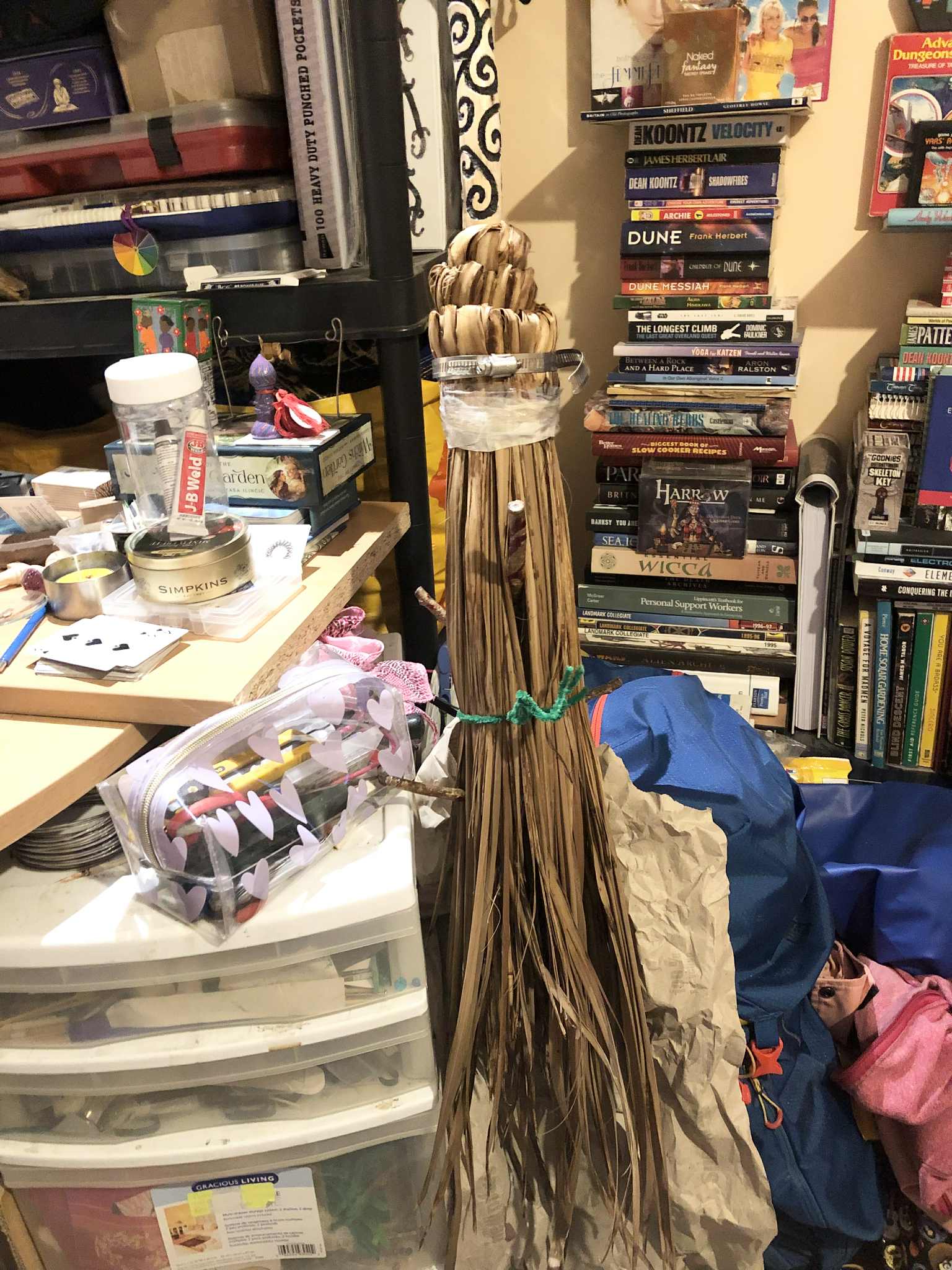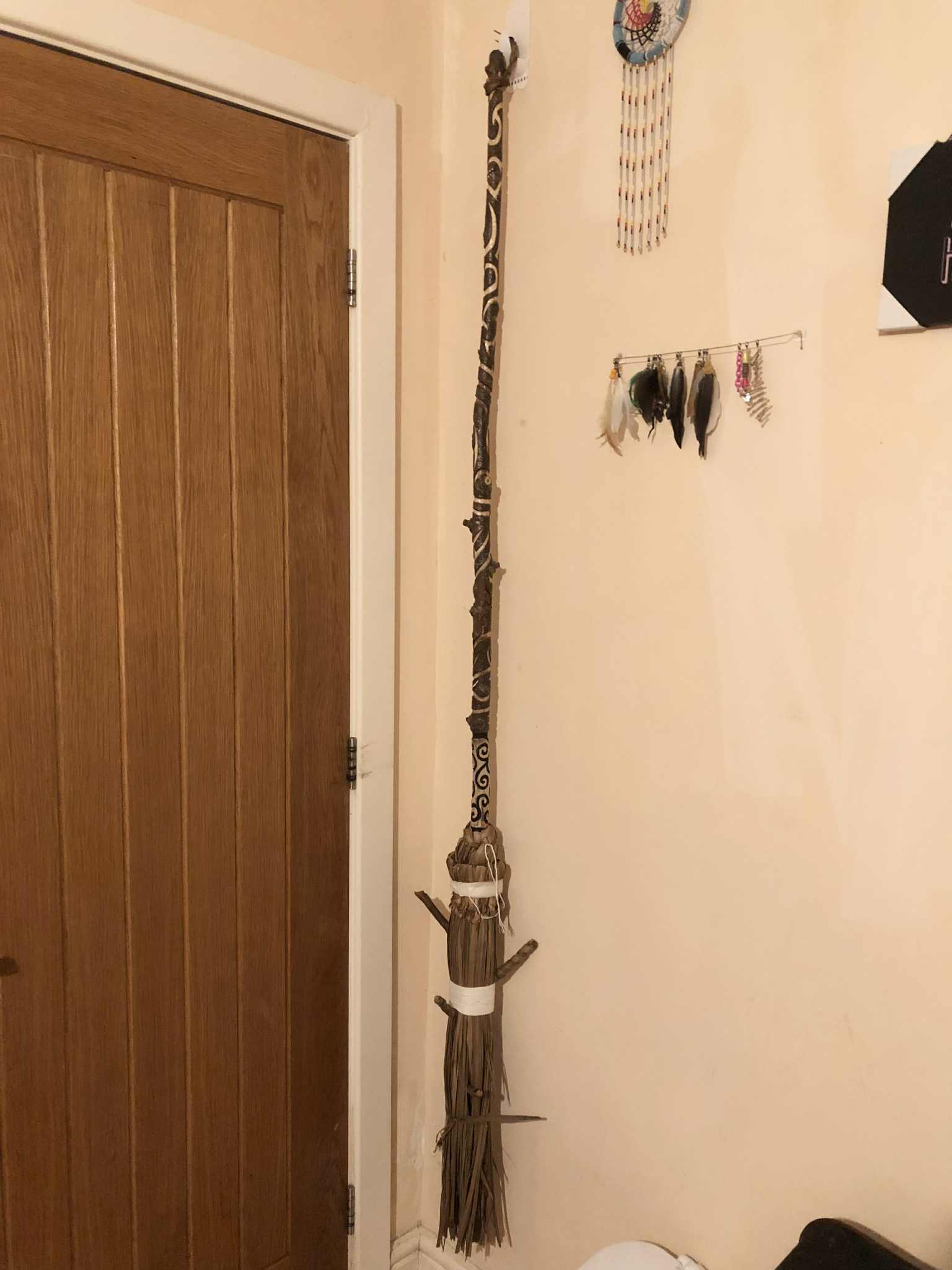 My witch's broom. It started as The Twisted Sisters, which had some halloween vibes put onto it, and was all cool and stuff, but... oh my GOODNESS is it inconvenient! I mean those branches sticking out, they look awesome, it wouldn't even look right without them, but WOW was it getting in the way! And FRAGILE. So after years of it sitting sitting with the other staves, forever making everything inaccessible, staves getting caught behind it, around it, those branches just *forever* being in the way. And I frustrated around it, until one day, someone in one of my online groups mentioned making a besom. And over the past, others have done so, and it was all awesome and stuff. And one day after it stuck in my craw one too many times, I decided, the best way to solve this was to turn The Twisted Sisters, which had been my default witch's broom because of the branches anyway, into a full besom. The bristles would protect the fragile head, bulk up the head around the branches in general to keep it from snagging on everything, and I could hang it on the wall to keep it out of the way in general, until actually using it for witchy purposes, like sweeping out the bad energy and such, also maybe sweeping in general.