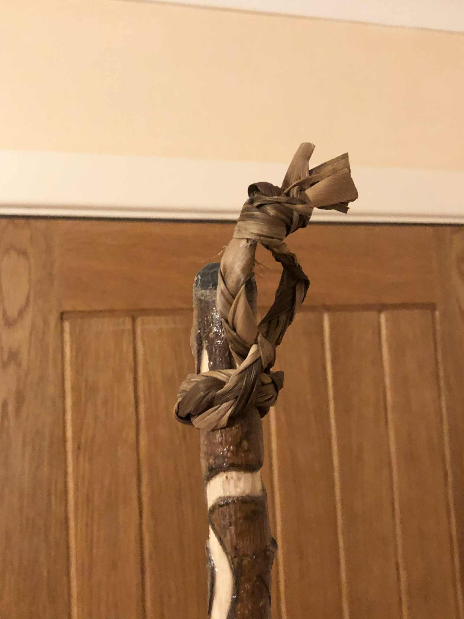 So, to fill it with good energy from the start, I went on a walk around to look for the leaves from the cabbage palm trees around England. There's some sticks in there too, roots, even some grass straw. I found my way to a large foresty area and spoke with the forest Spirits there, and was offered specific branches and sticks and such, which found their way into the first layer or so of the broom. Also a crow feather, since I wear a crow pendant around my neck. And the palm fronds (more technically I suppose palm leaves, since this particular type of palm has long individual leaves rather than the fan style, which are also around, but wouldn't make as good of broom bristles, but I digress), those have more or less been somewhere nearby to where I live every since my first time even meeting Abby in London, so it seemed fitting to use that as the majority of the besom bristles. Also, they would make for a fairly nice sweeping broom as a whole. And so with supplies gathered, we used some elastics to get our first layer of leaves wrapped around the staff (also where most of the branches, twigs, and feather are), and conveniently the leaves are able to bend over the elastic without breaking, so that I could cover the elastic with an elegant folded band of leaves. We then did the same to add our second layer of leaves over and slightly below the first, making for an elegant widening of the broom. I mean, the stave's branches are still gonna stick out, but it'll be a LOT better. And it can always be reverted to The Twisted Sisters down the road if I wish, and just remake my besom. But we'll give this thing several more layers of bristles to at least get a lot closer. I set the first layer to about the middle point of the grip, since I pictured that just looking the best, with that bit of swirly carving leading to the broom head, but not too much. And at this point, mid July when this began, I've now gathered all of the palm leaves in my surrounding area, and must wait for more to fall throughout the autumn. Stage 1 made July 16, 2025 |