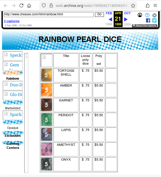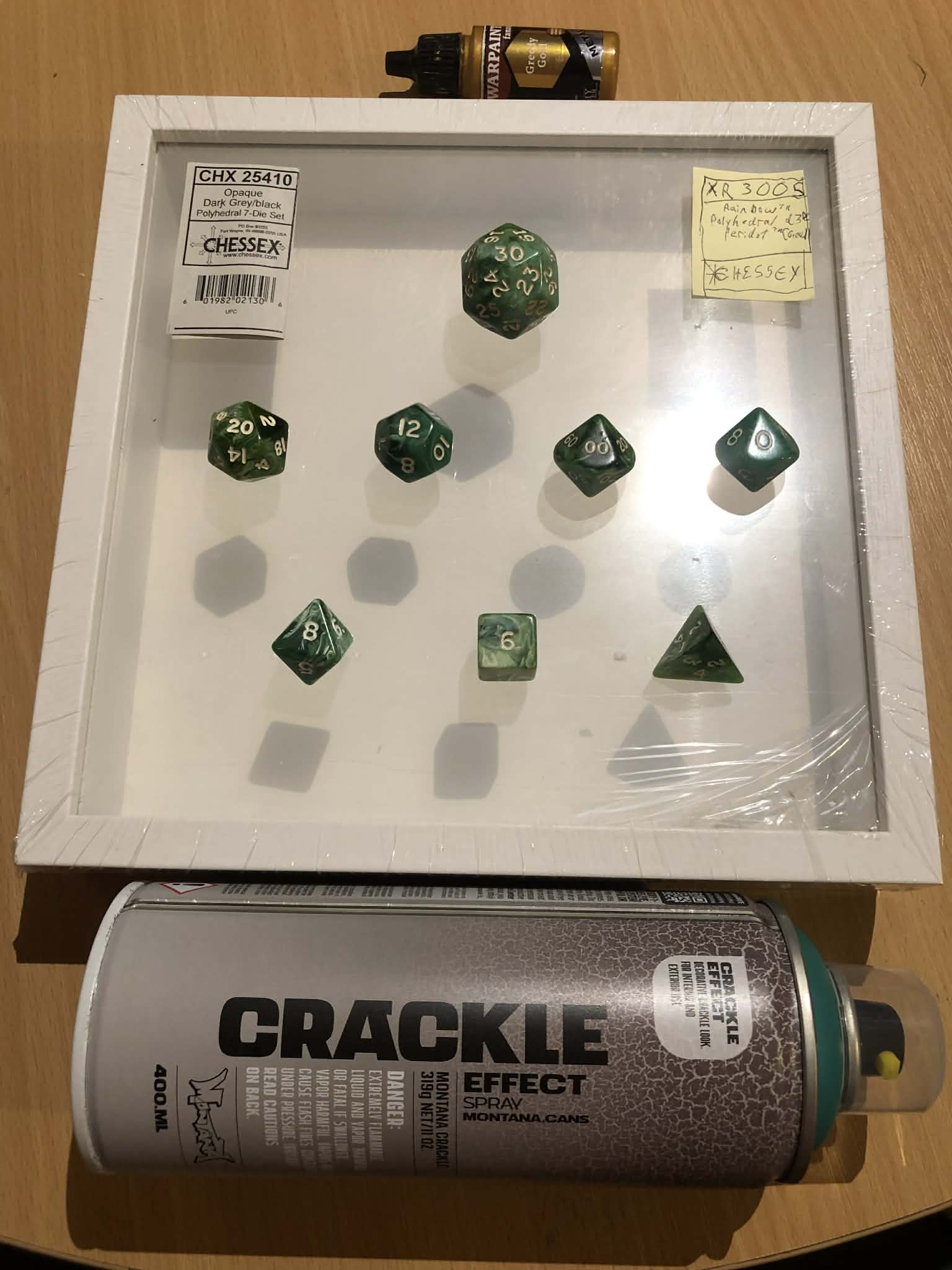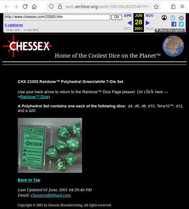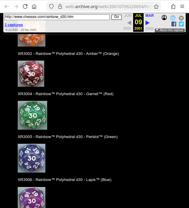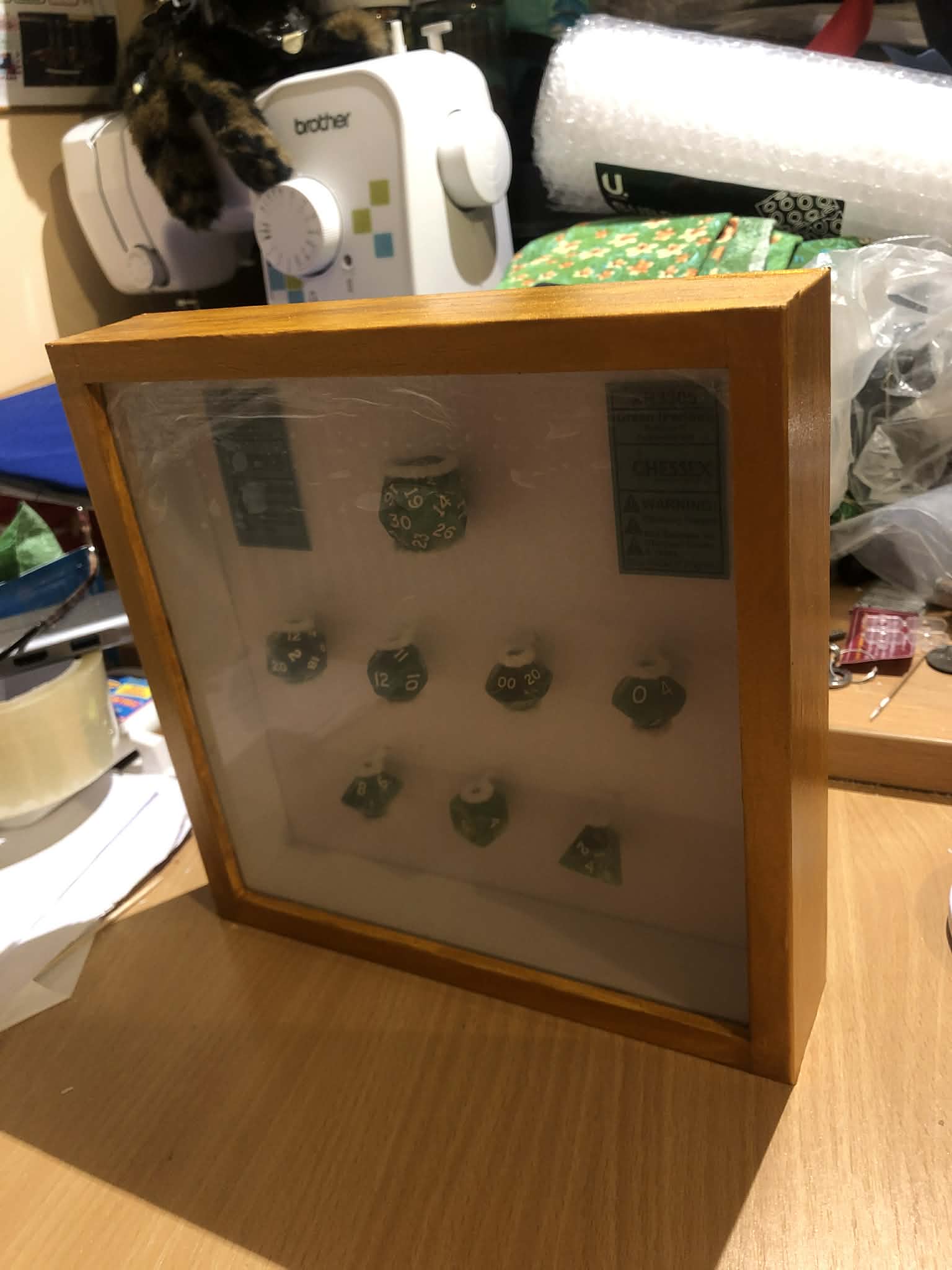 The frame build page! I originally started this on the dice page, but the progress was starting to get complicated enough that I didn't want it cluttering the dice page, so you get your own page here, tuck you away back here. As I'd said on the main page, I'd debated whether to piece together my own set, and had actually paid far less for a partial set before researching more and discovering that the percentile is ALSO extremely hard to find. So rather than worry about never finding that (the partial set will be for my rolling dice, so I can still enjoy playing with this pattern ^_^ . Also they could be good for tradeables!), I just ordered the full set listed (strangely from Flin Flon, very near to where I used to live)! Aaaand that my friends. Those eight dice, as of January 2026, are worth £300gbp / $400usd / $500cad! Those seven dice arriving over doubled in price the second they arrived at my door (February 16th)! Naturally, we need to display these. A shadow box frame will suit this best, with the dice gently suspended to be as fully visible as possible. Also, I have already attempted to contact Chessex in order to get an info label that they normally come with for the display, but they said that this set CHX 23305 is so old (out of print in 2001, older than Zebeth!!!), that they don't have any copies of it in their archives, or system at all! So we will have to make a mock-up to put in the frame with them (and label it as such on the back of the label, for transparency purposes). So... let's get started! Ooohhhh, and leading up to this, we did some research, and found some epic things. First, allow me to link you to the present day webpages for these dice on the DrNoD DiceDB (db.drnod.de) and Miraheze Dice Collecting wiki (dice.miraheze.org). Secondly, we decided to dig into the Chessex webpage (chessex.com), but on archive.org, where we found the first mention of these as a polyhedral set in 1999 (archive.org), the first mention of the poly set as CHX 23305 Rainbow™ Peridot™(Green)/white (also CHX 23305 Rainbow™ Polyhedral Green/white 7-Die Set) in June 2000 (archive.org), the first mention of the d30 as XR3005 - Rainbow™ Polyhedral d30 - Peridot™ (Green) in October 2000 (archive.org) (images weren't backed up in those though, but the 1999 link shows the d6 of the poly set (screenshot), and the full poly image was backed up in July 2001 (archive.org) (screenshot), and the d30 also in July 2001 (archive.org) (screenshot).