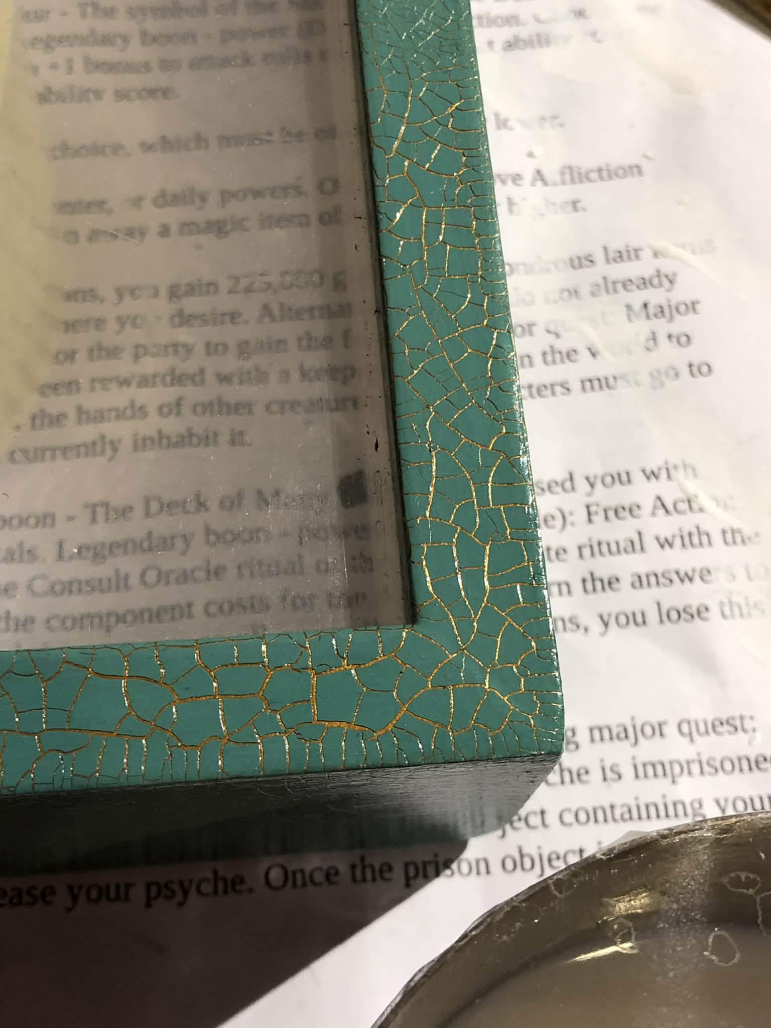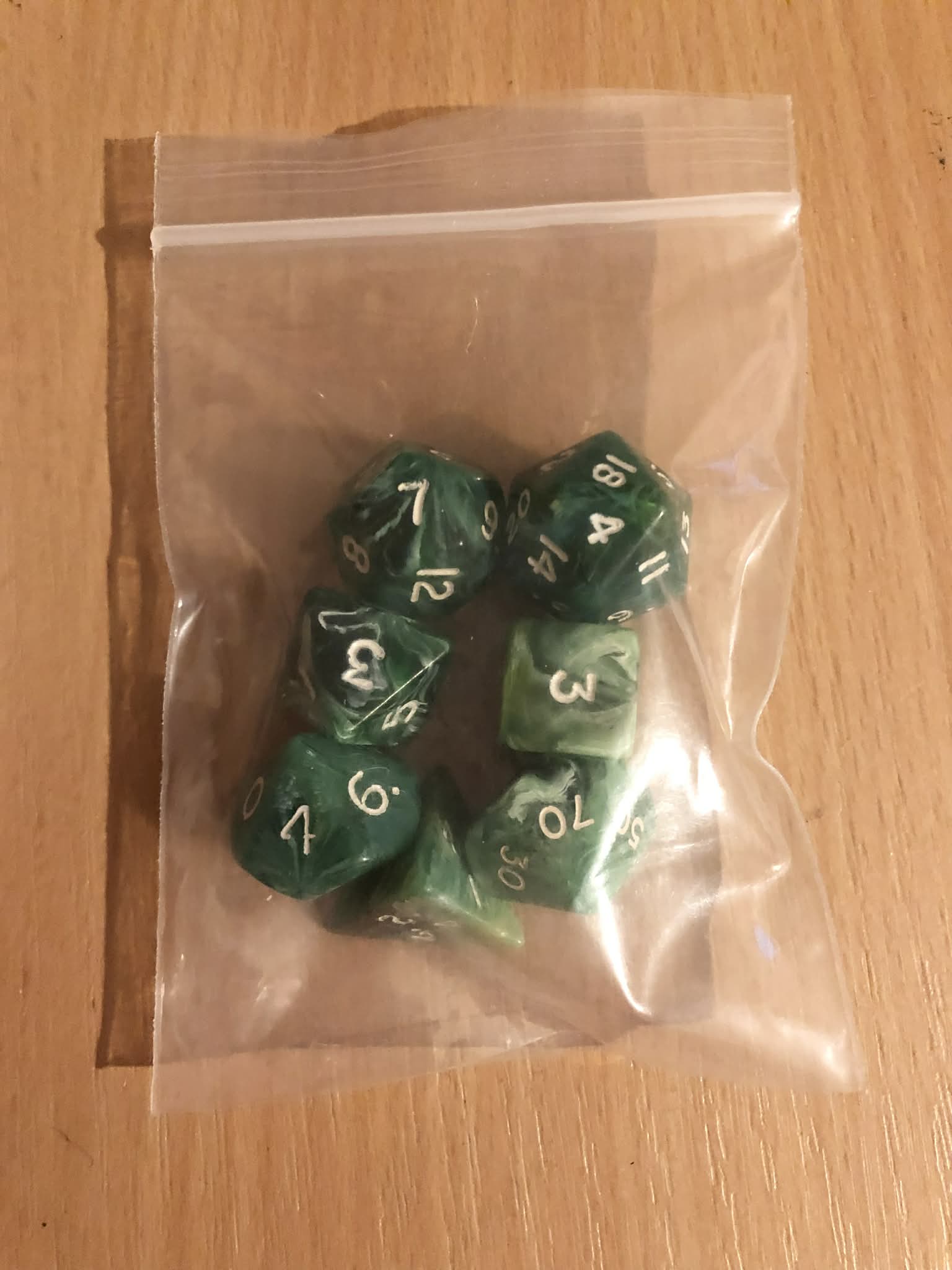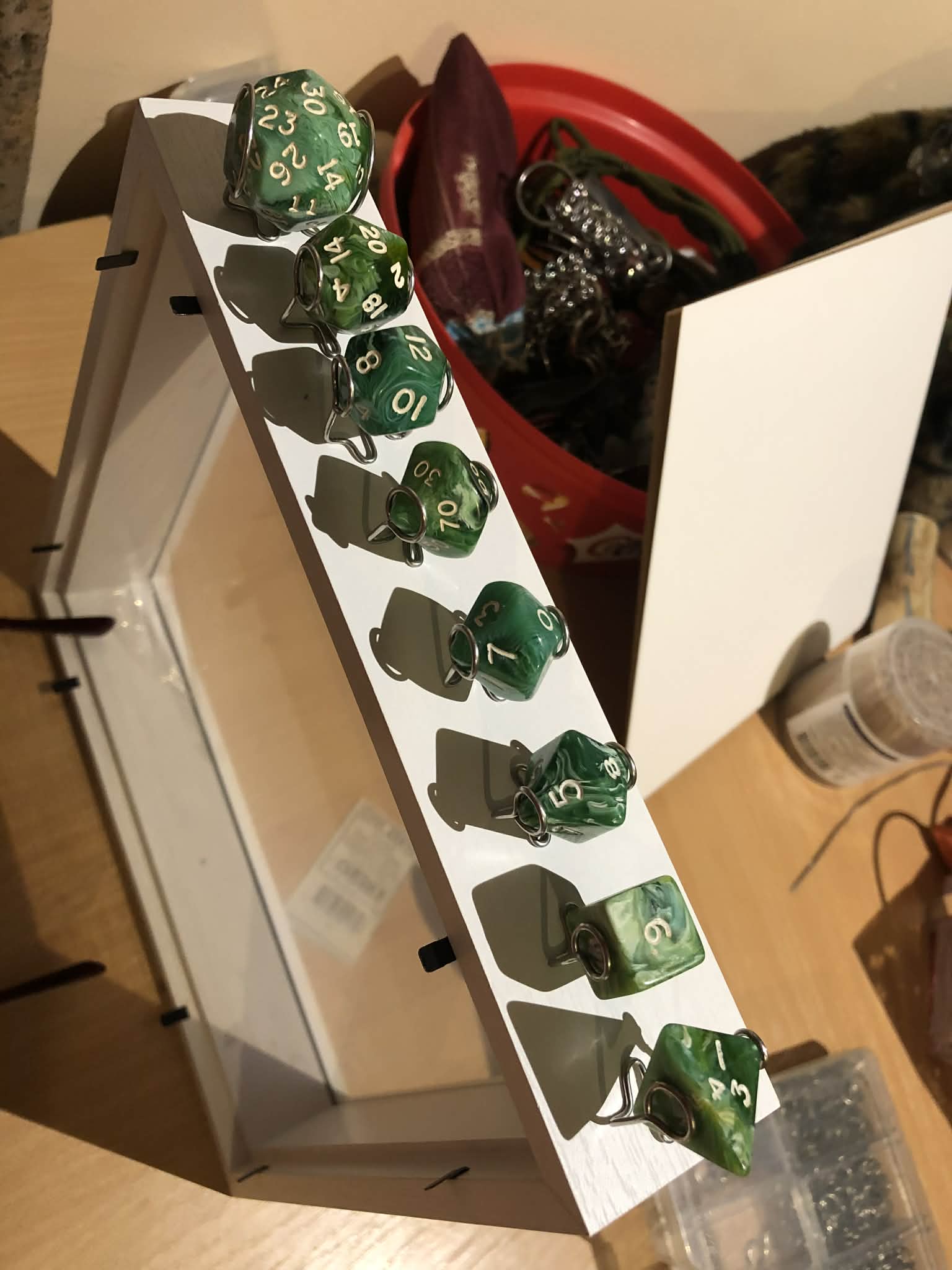The frame build page! I originally started this on the dice page, but the progress was starting to get complicated enough that I didn't want it cluttering the dice page, so you get your own page here, tuck you away back here. As I'd said on the main page, I'd debated whether to piece together my own set, and had actually paid far less for a partial set before researching more and discovering that the percentile is ALSO extremely hard to find. So rather than worry about never finding that (the partial set will be for my rolling dice, so I can still enjoy playing with this pattern ^_^ . Also they could be good for tradeables!), I just ordered the full set listed (strangely from Flin Flon, very near to where I used to live)! Aaaand that my friends. Those eight dice, as of January 2026, are worth £300gbp / $400usd / $500cad! Those seven dice arriving over doubled in price the second they arrived at my door (February 16th)! Naturally, we need to display these. A shadow box frame will suit this best, with the dice gently suspended to be as fully visible as possible. Also, I have already attempted to contact Chessex in order to get an info label that they normally come with for the display, but they said that this set CHX 23305 is so old (out of print in 2001, older than Zebeth!!!), that they don't have any copies of it in their archives, or system at all! So we will have to make a mock-up to put in the frame with them (and label it as such on the back of the label, for transparency purposes). So... let's get started! Ooohhhh, and leading up to this, we did some research, and found some epic things. First, allow me to link you to the present day webpages for these dice on the DrNoD DiceDB (db.drnod.de) and Miraheze Dice Collecting wiki (dice.miraheze.org). Secondly, we decided to dig into the Chessex webpage (chessex.com), but on archive.org, where we found the first mention of these as a polyhedral set in 1999 (archive.org), the first mention of the poly set as CHX 23305 Rainbow™ Peridot™(Green)/white (also CHX 23305 Rainbow™ Polyhedral Green/white 7-Die Set) in June 2000 (archive.org), the first mention of the d30 as XR3005 - Rainbow™ Polyhedral d30 - Peridot™ (Green) in October 2000 (archive.org) (images weren't backed up in those though, but the 1999 link shows the d6 of the poly set (screenshot), and the full poly image was backed up in July 2001 (archive.org) (screenshot), and the d30 also in July 2001 (archive.org) (screenshot).